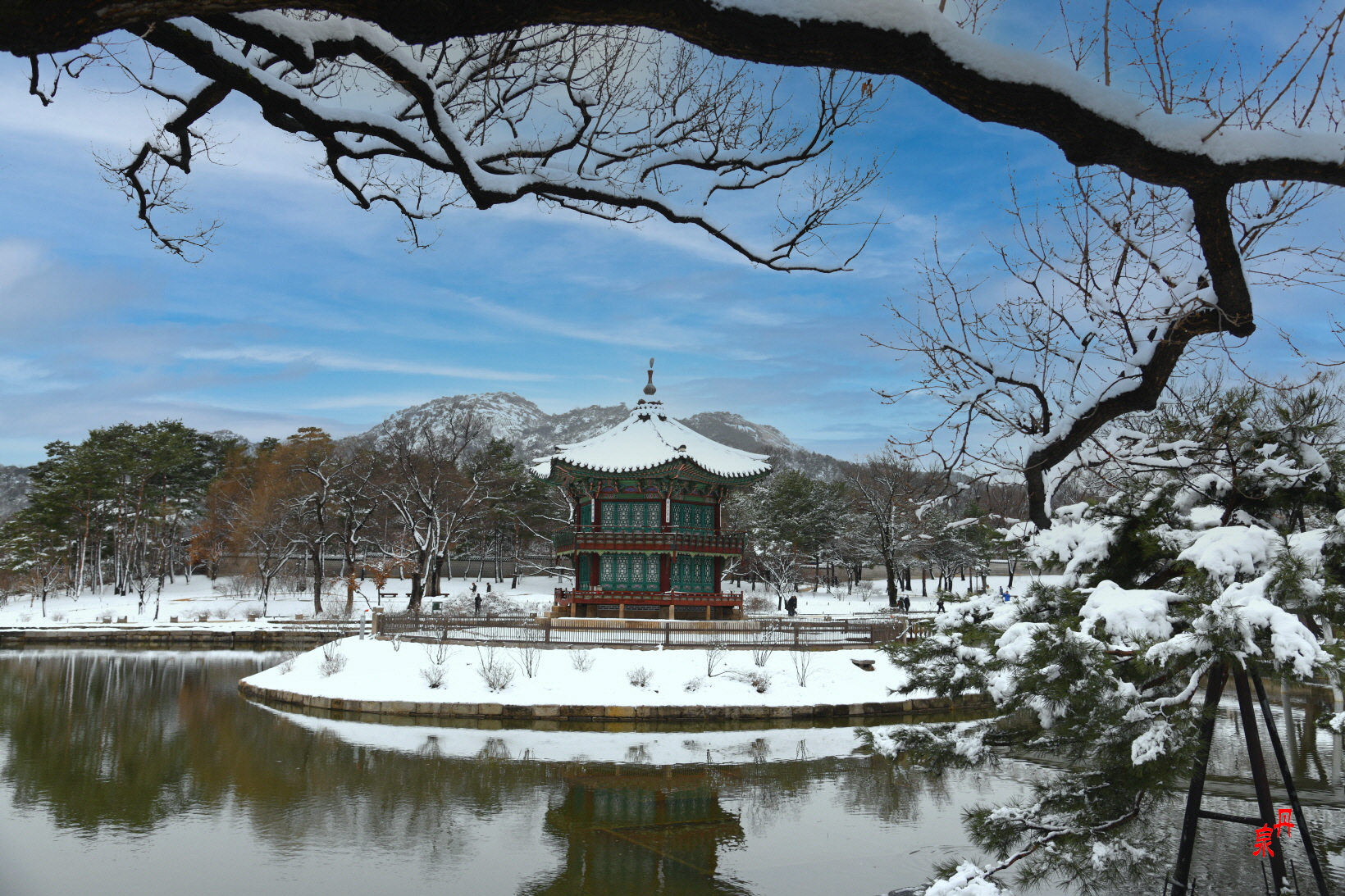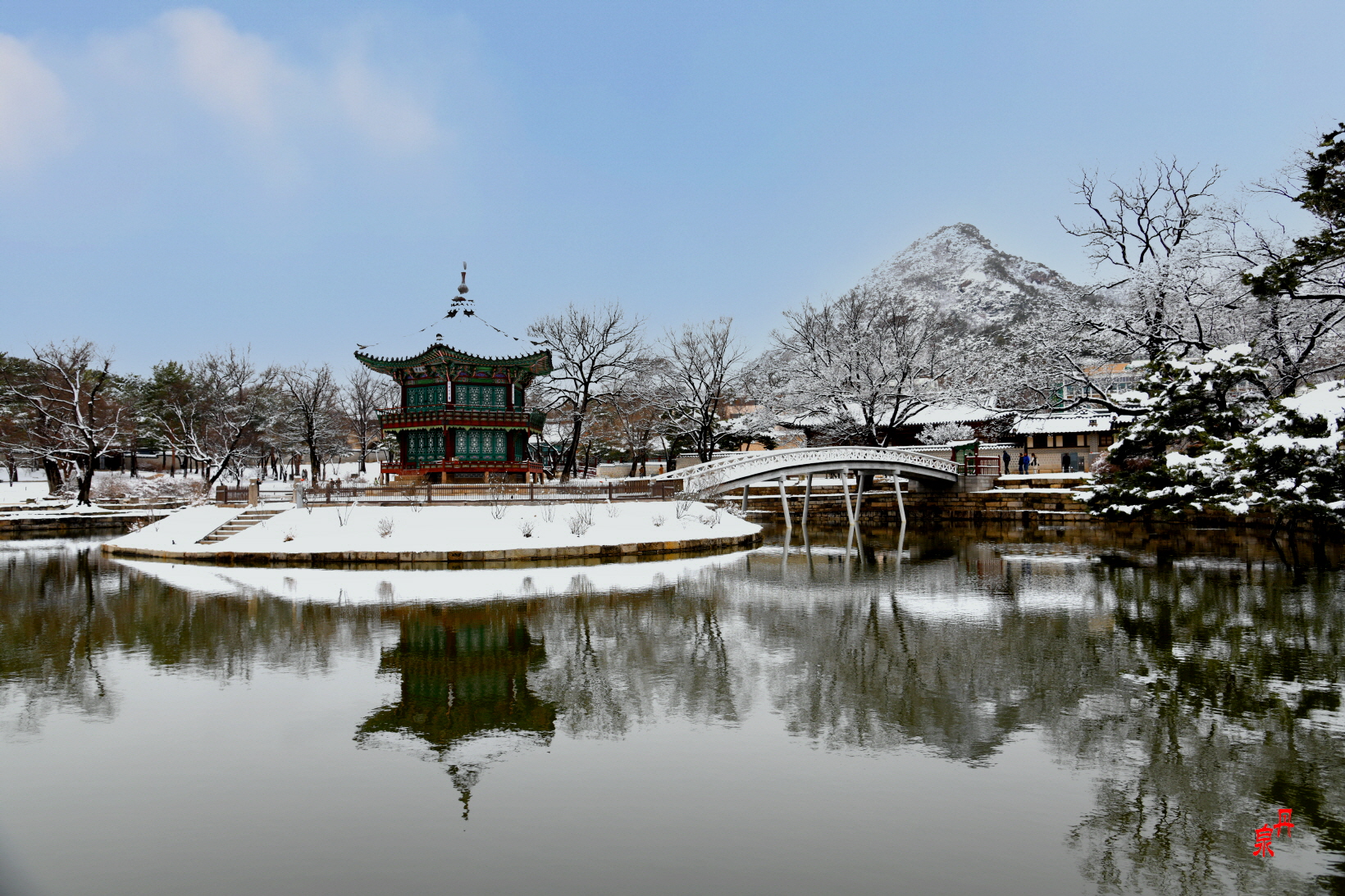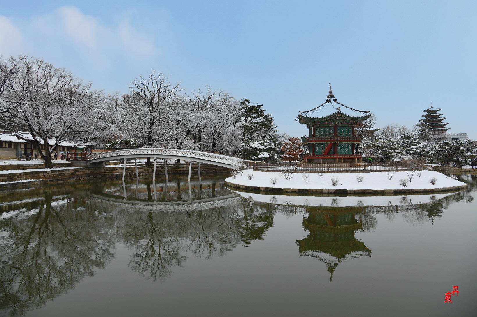 향원정을 건너는 다리 취향교를 새로 흰색으로 공사하였는데 눈이 내린 겨울과 잘 어울린다