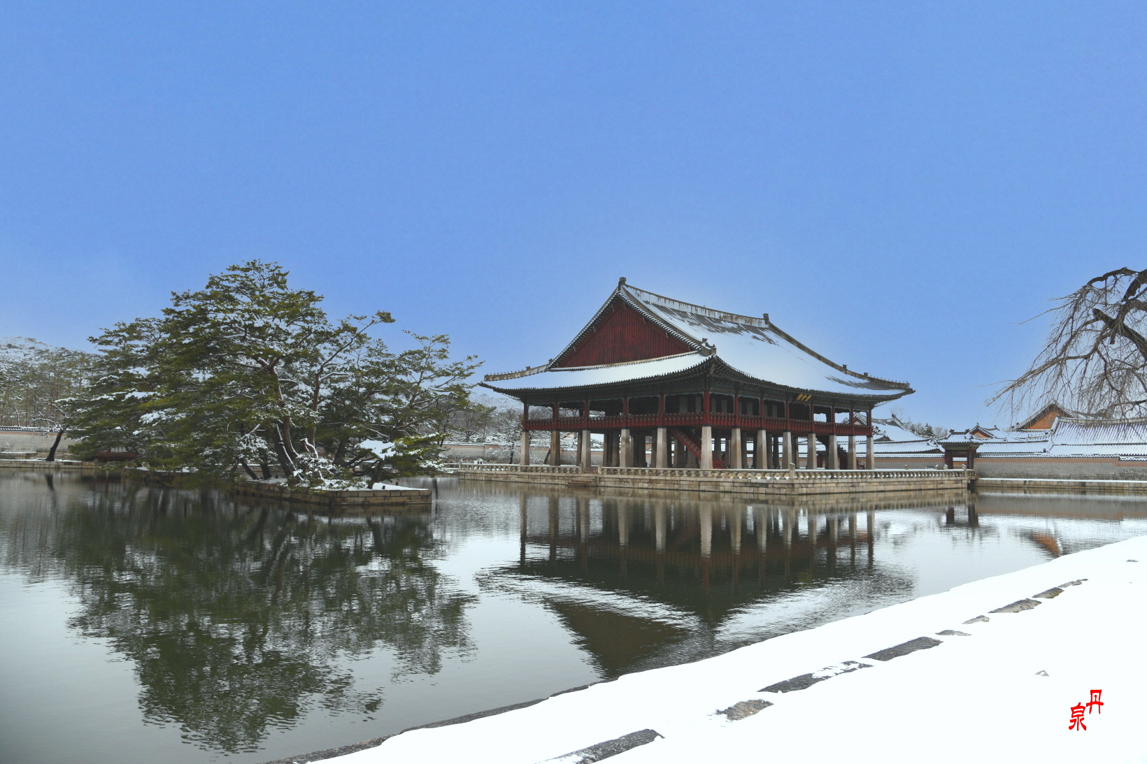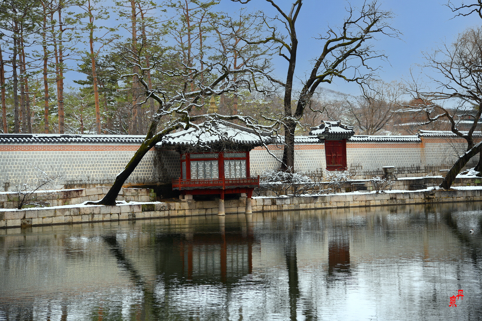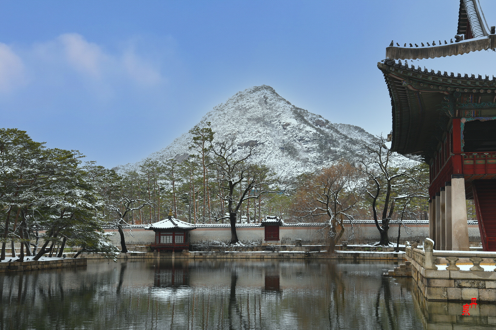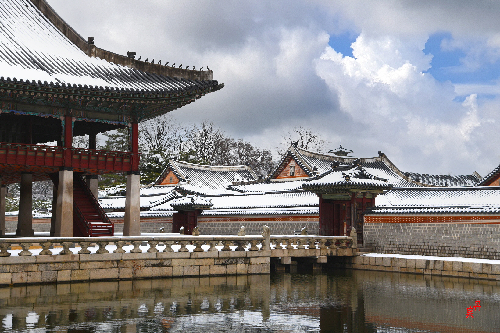 향원정을 건너는 다리 취향교를 새로 흰색으로 공사하였는데 눈이 내린 겨울과 잘 어울린다