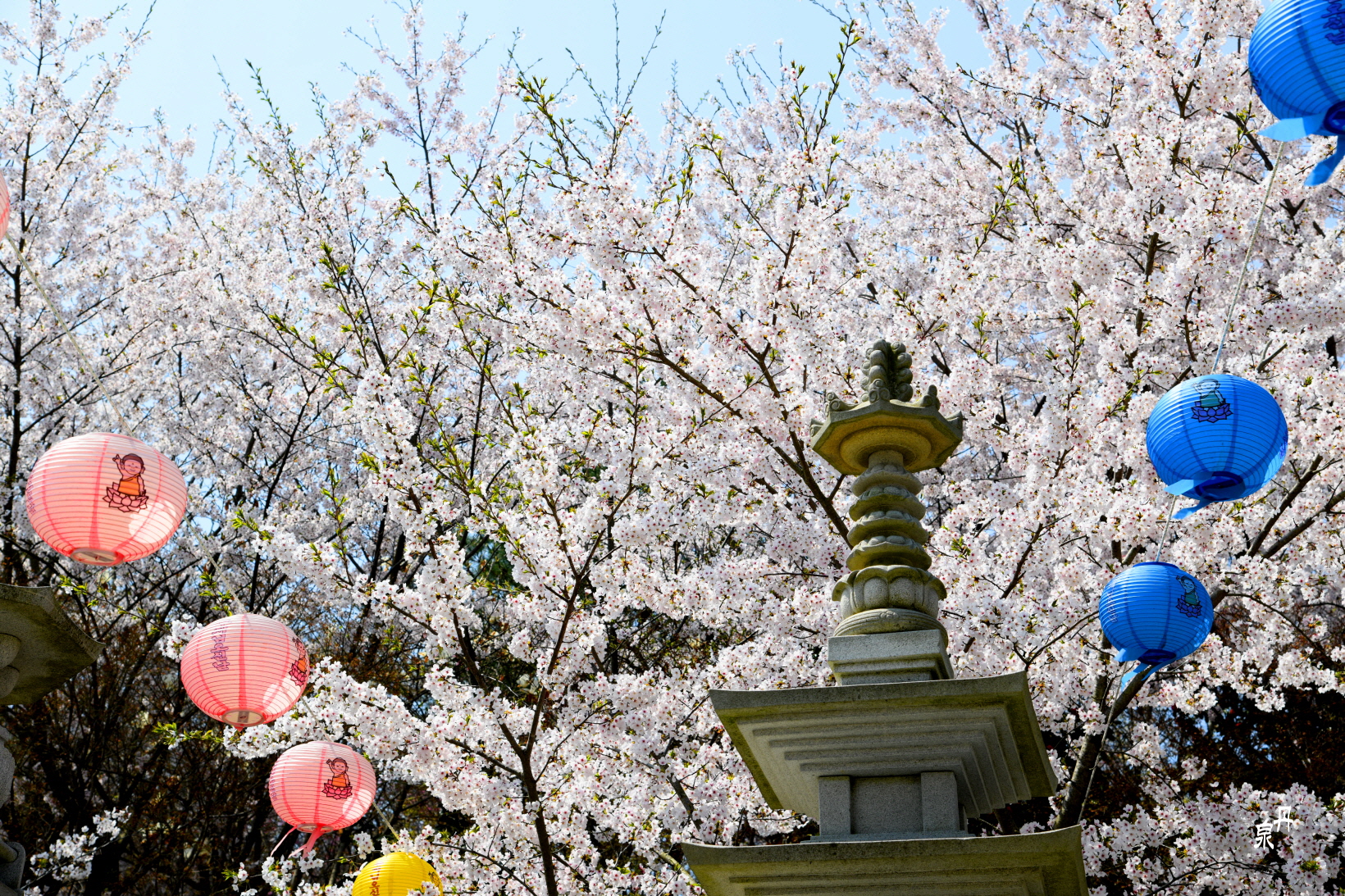 하얀 벚꽃 분홍 벚꽃 노란 개나리 그리고 연등이 봄바람에 춤을 춘다