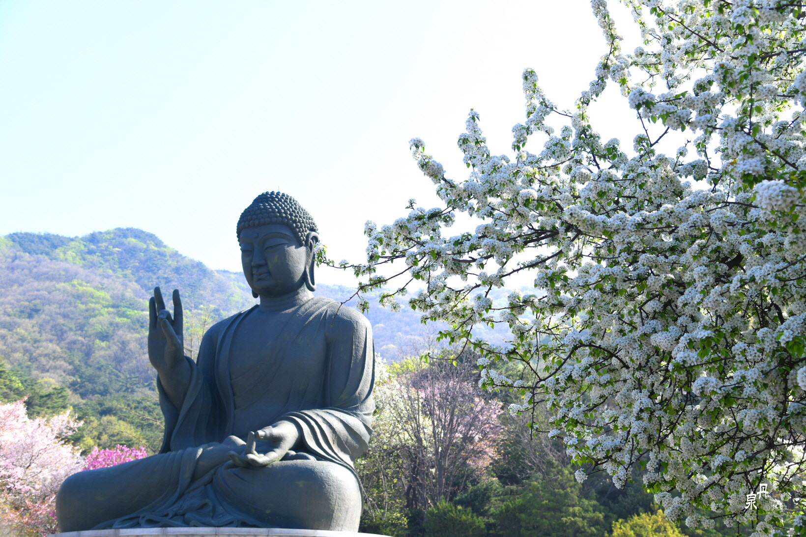 각원사의 자랑 청동 대좌불이 꽃 속에 묻혀 있다