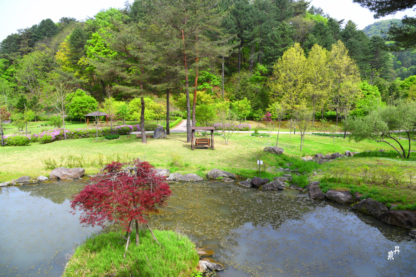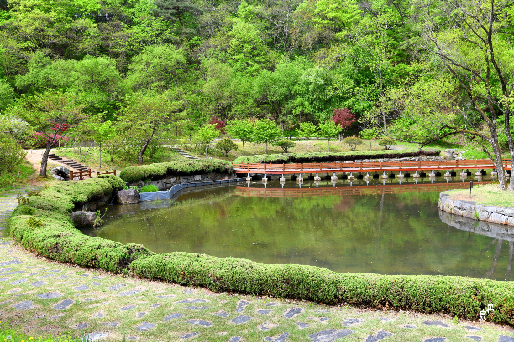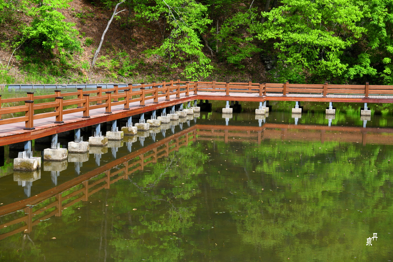 아침의 잔잔한 연못이 예쁜 반영을 보여준다