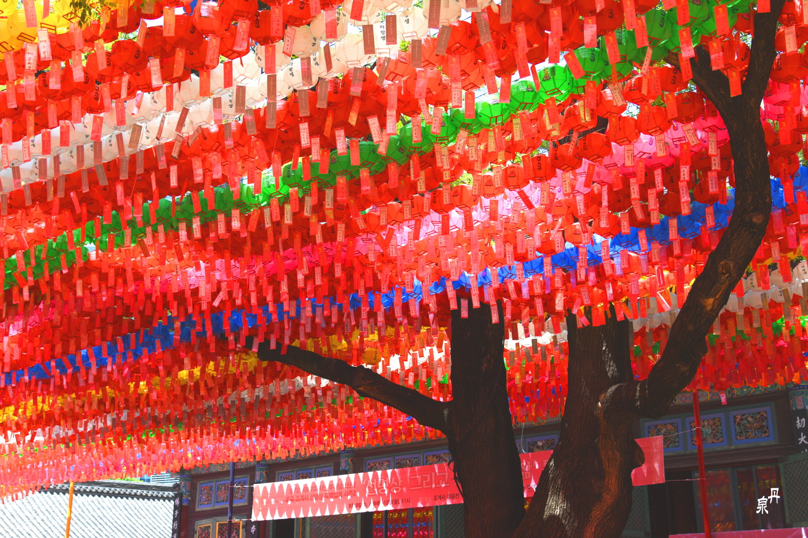 조계사 대웅전 마당에 거대한 회화나무가 연등에 가려져 있다