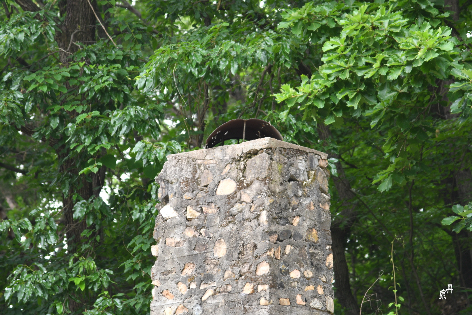 굴뚝 위에는 빗물을 막아주는 시설인지 녹이 슬고 구멍이 뚫린 철 구조물이 있다