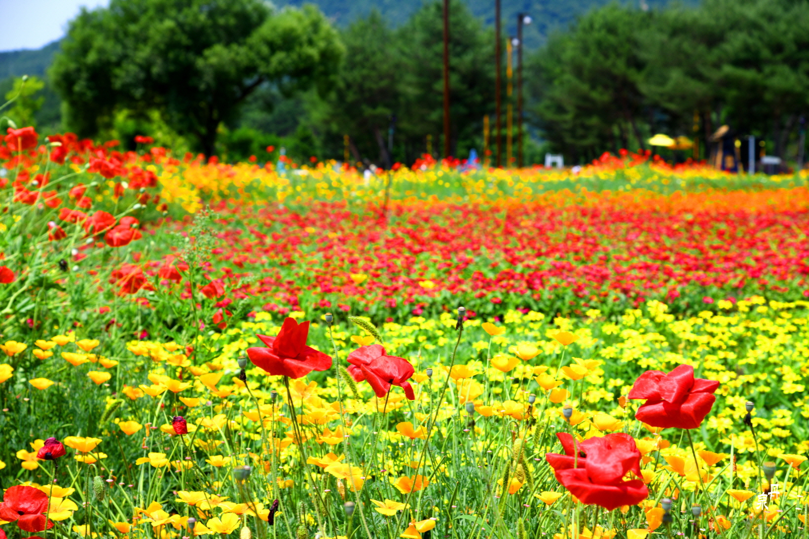 강변에 핀 꽃양귀비가 유독 아름답게 보인다