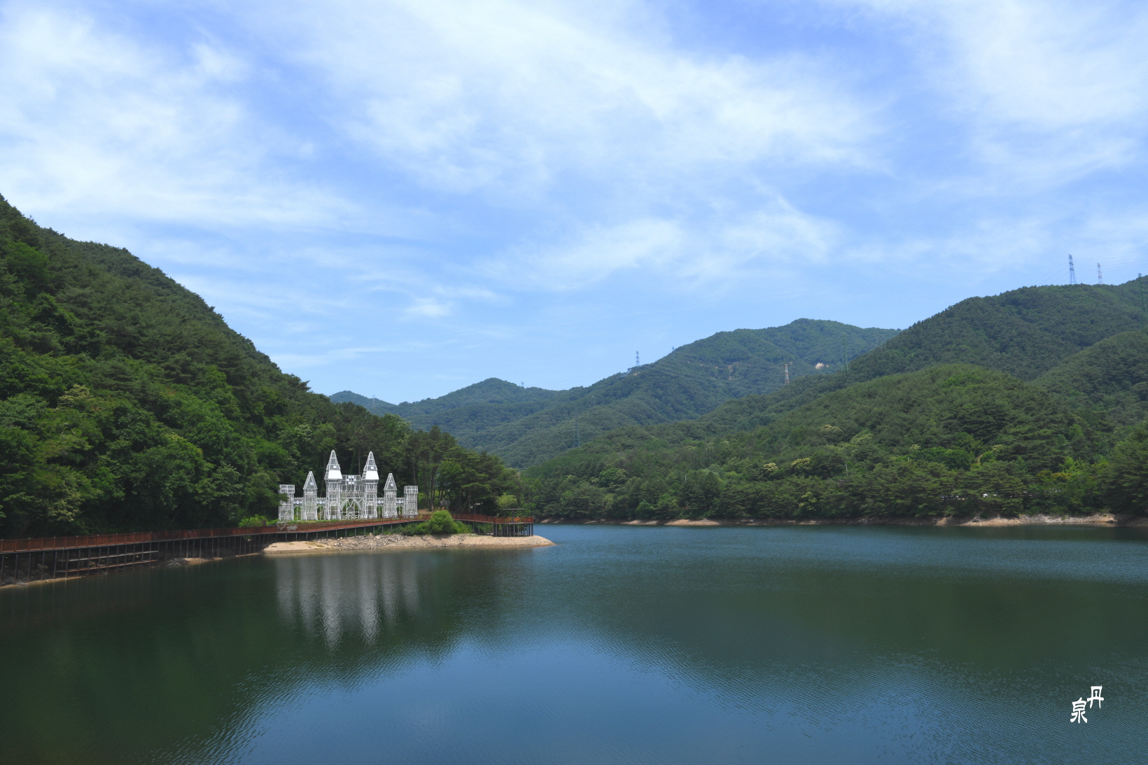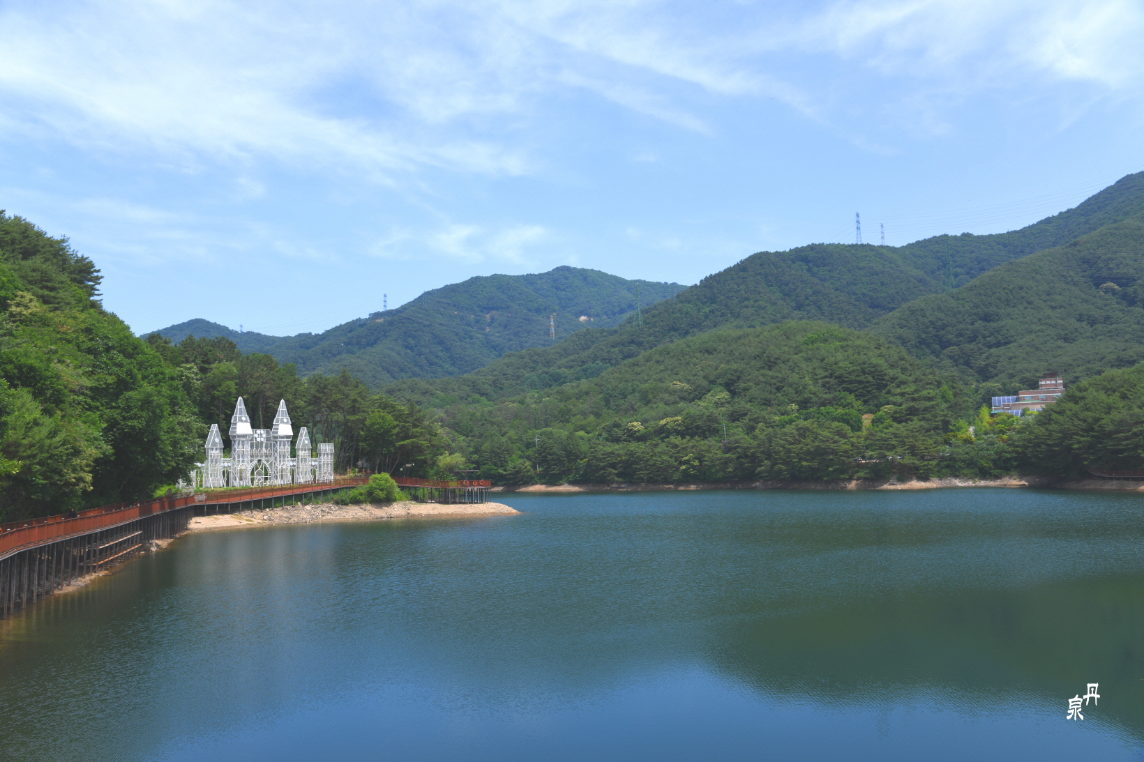 저수지 물가에 하얀 구조물이 마치 유럽의 고풍스러운 성을 보는 것 같다