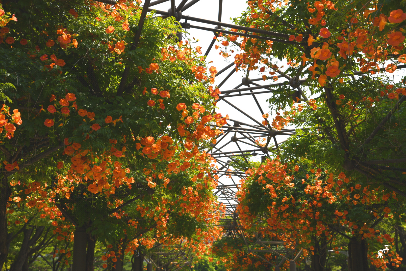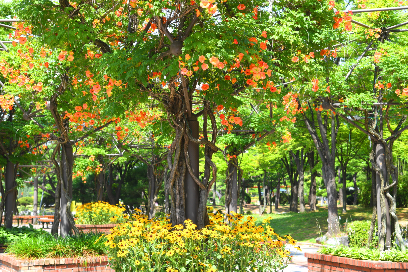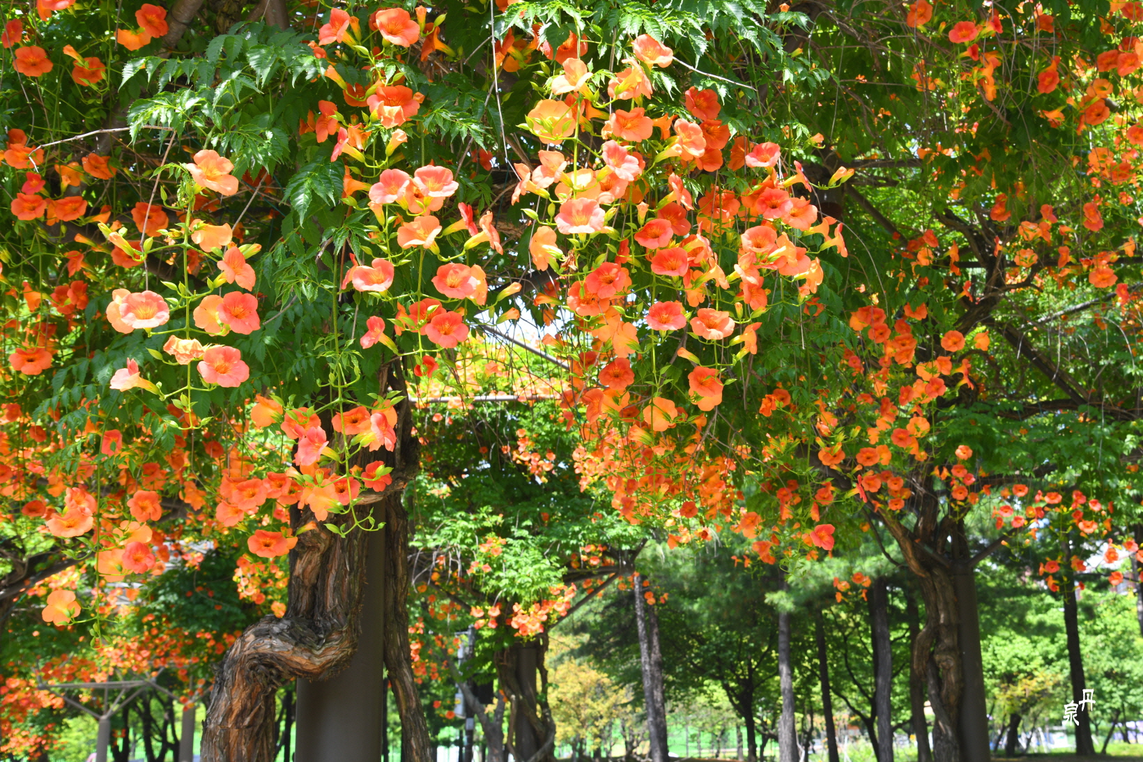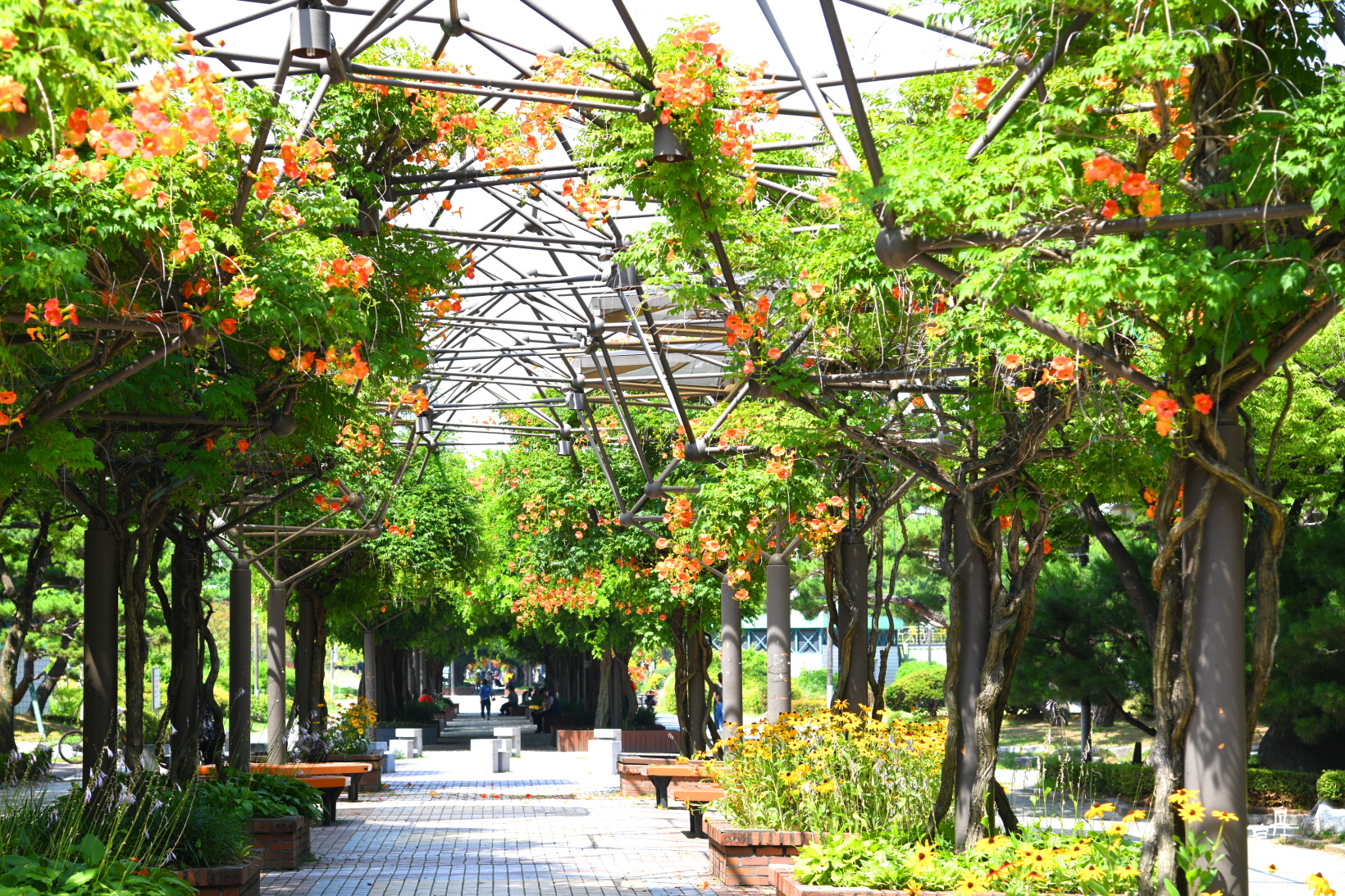 구조물을 이용하여 능소화 넝쿨을 만들어 터널을 이루고 있다