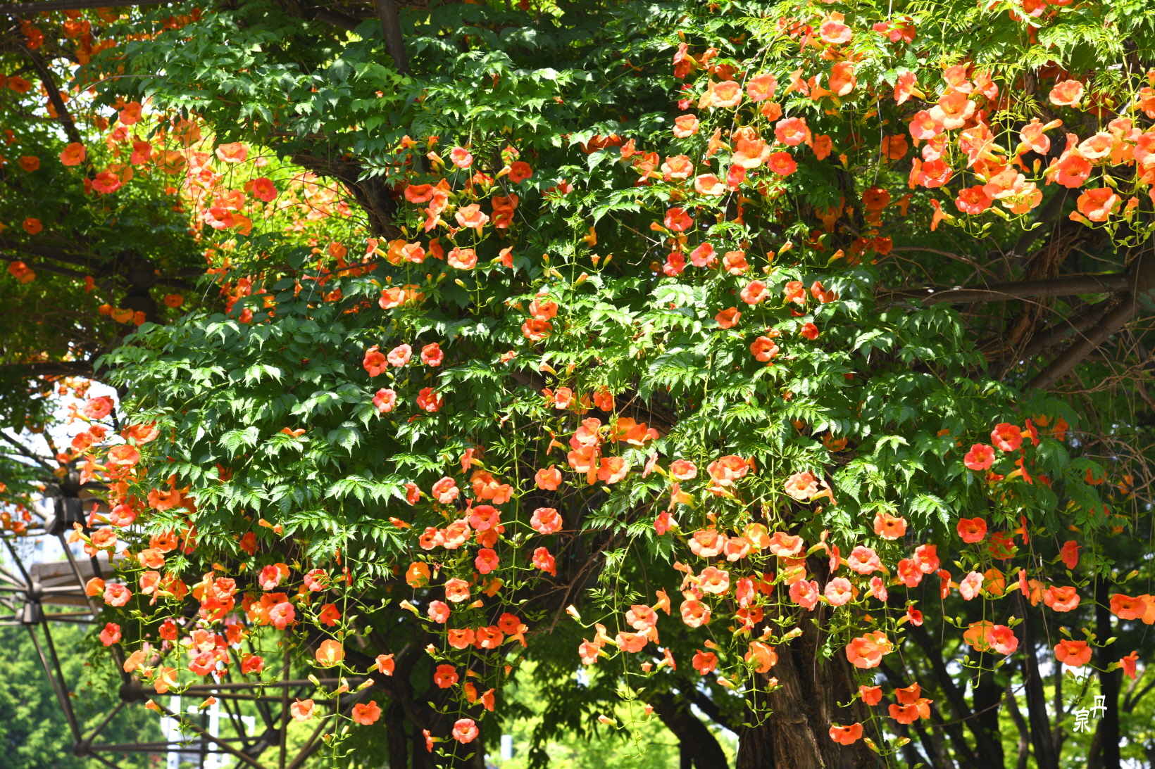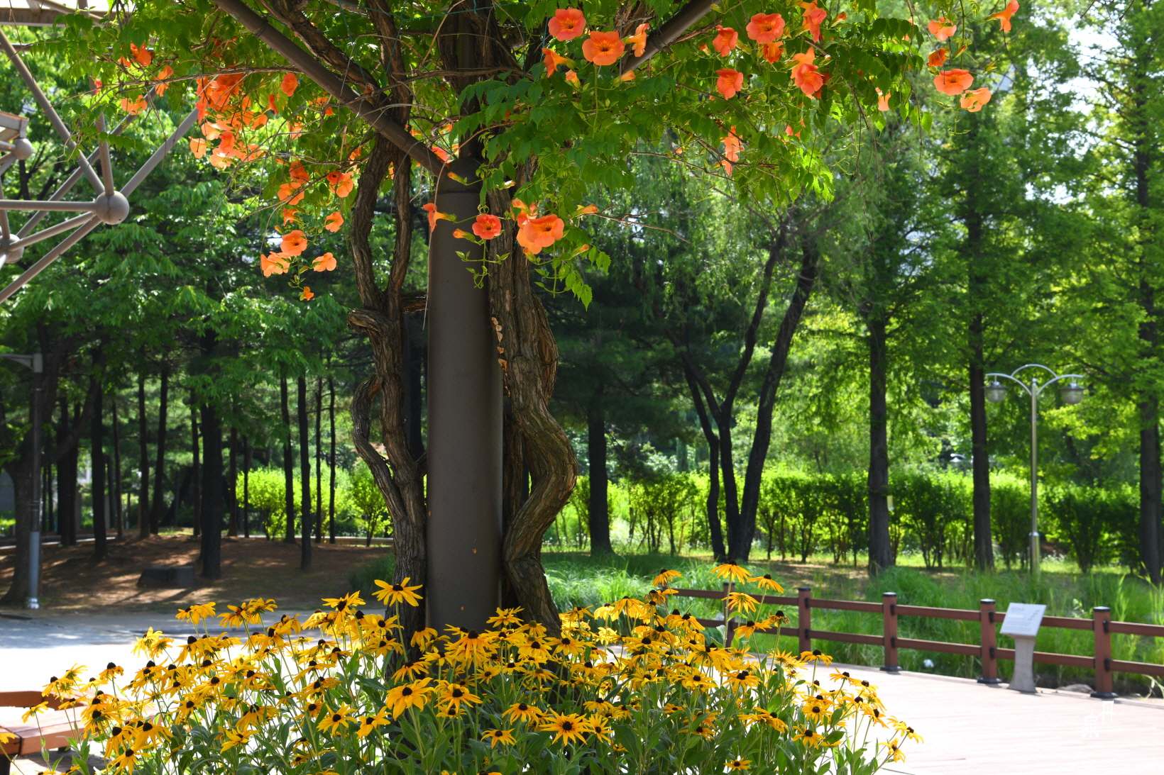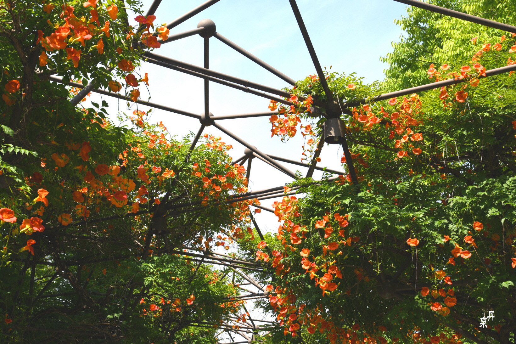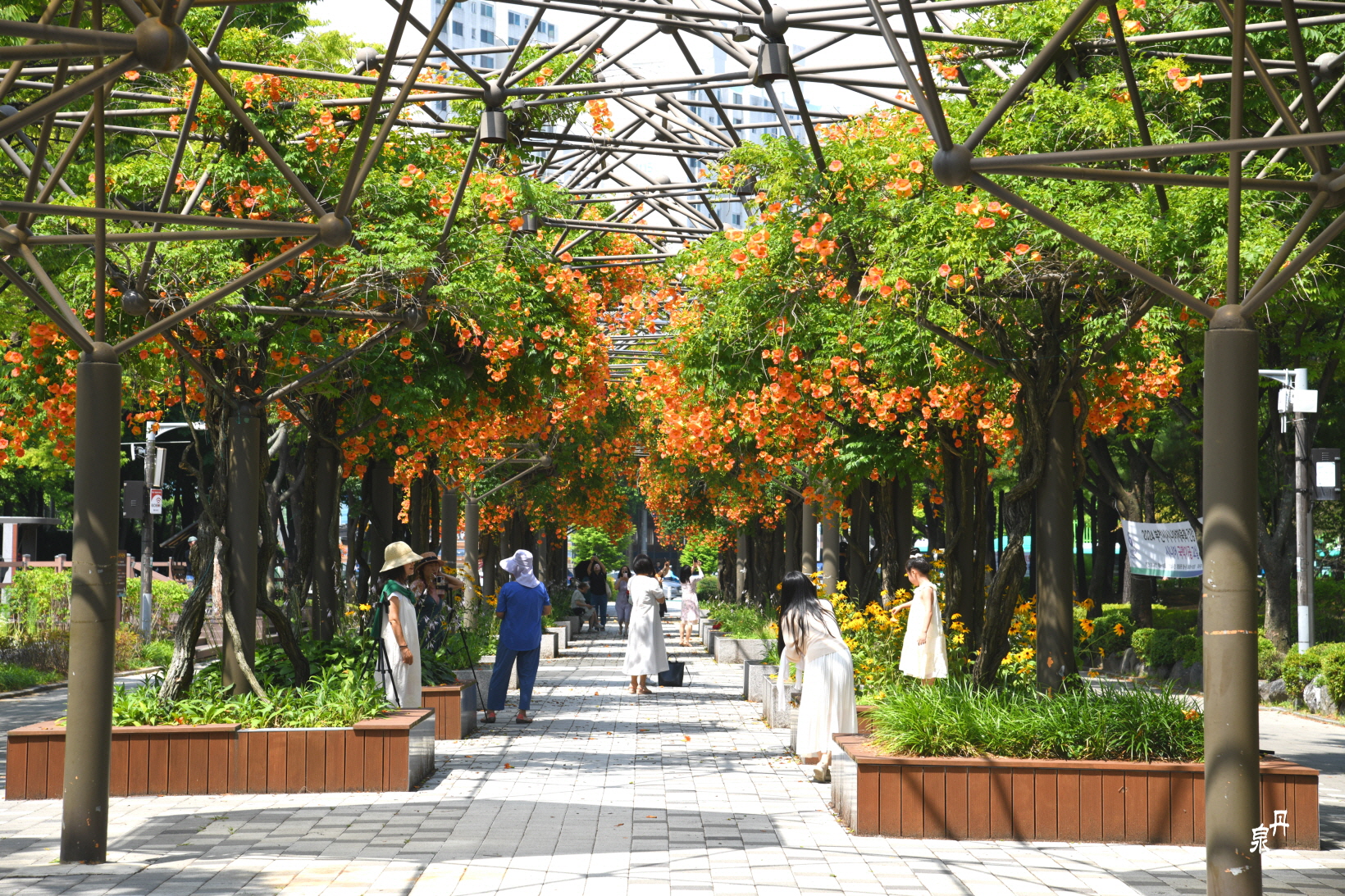 구조물을 이용하여 능소화 넝쿨을 만들어 터널을 이루고 있다