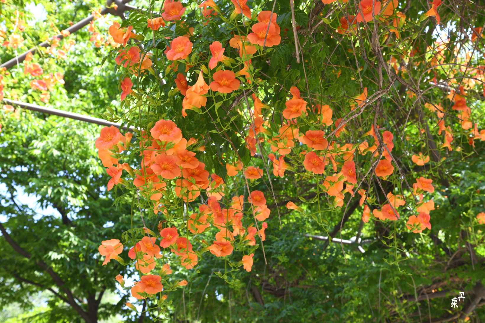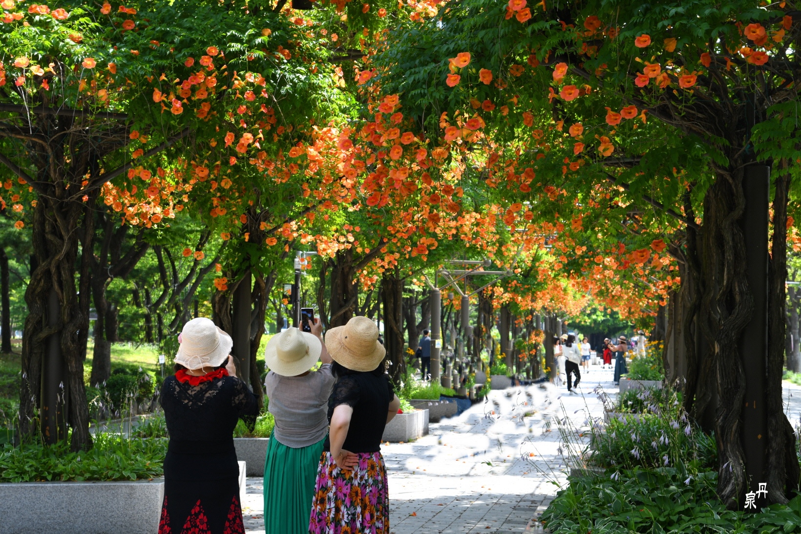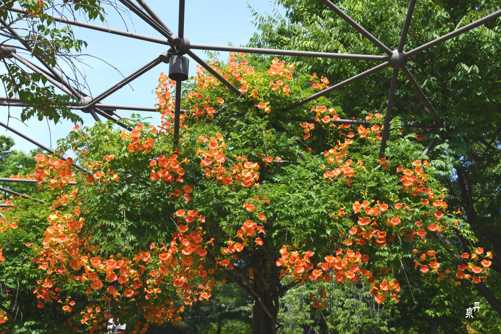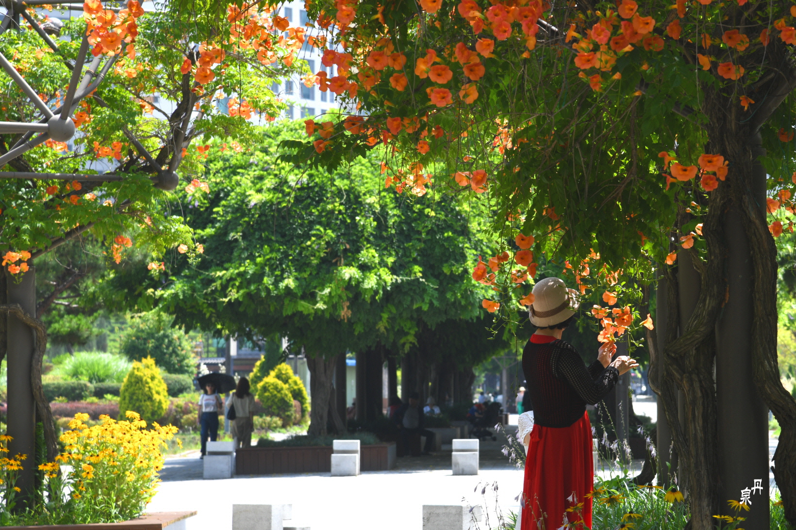 구조물을 이용하여 능소화 넝쿨을 만들어 터널을 이루고 있다