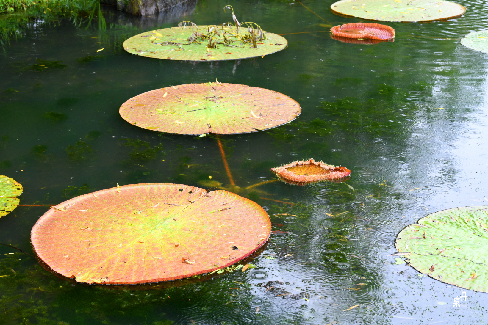 비가 세차게 내리는데도 빅토리아 연에는 물이 고이지 않는다
