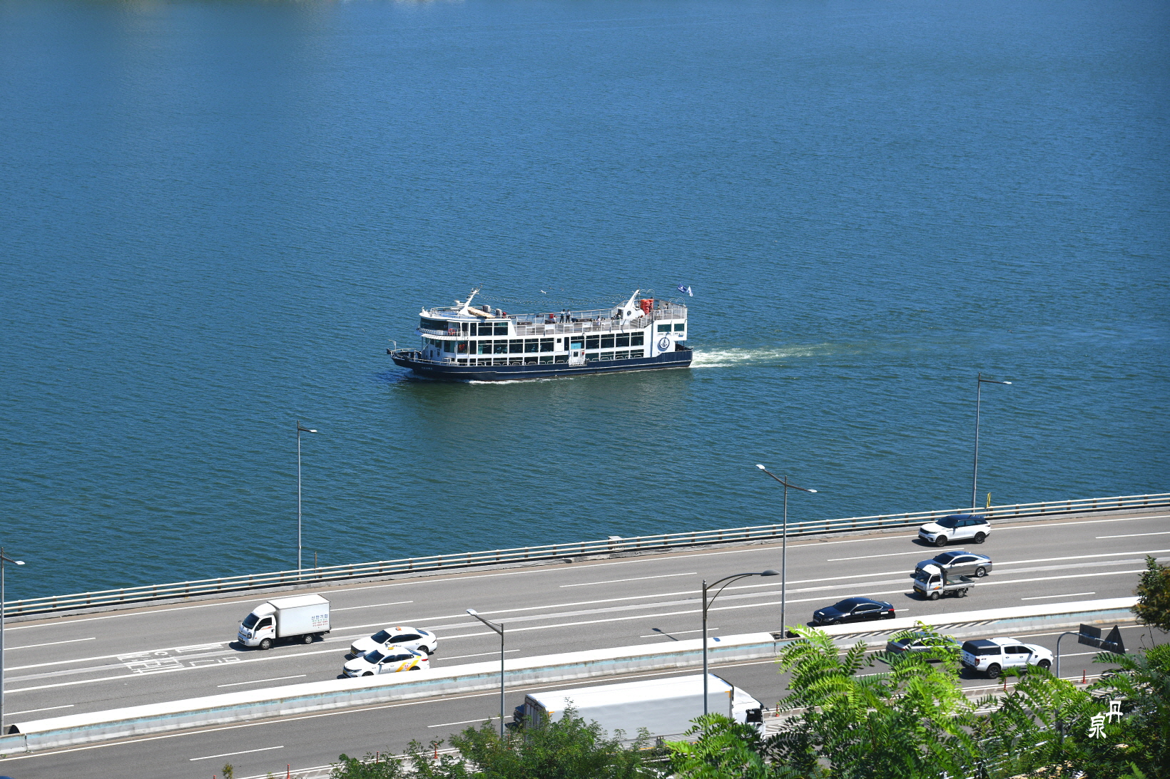 강물에는 유람선이 떠있고