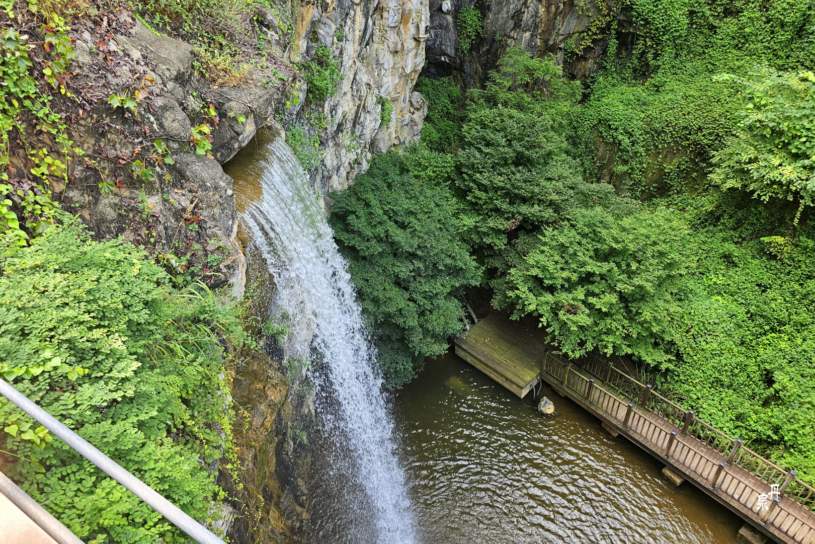 출렁다리에서 내려 보이는 인공폭포와 연못이 예쁘고 시원하다