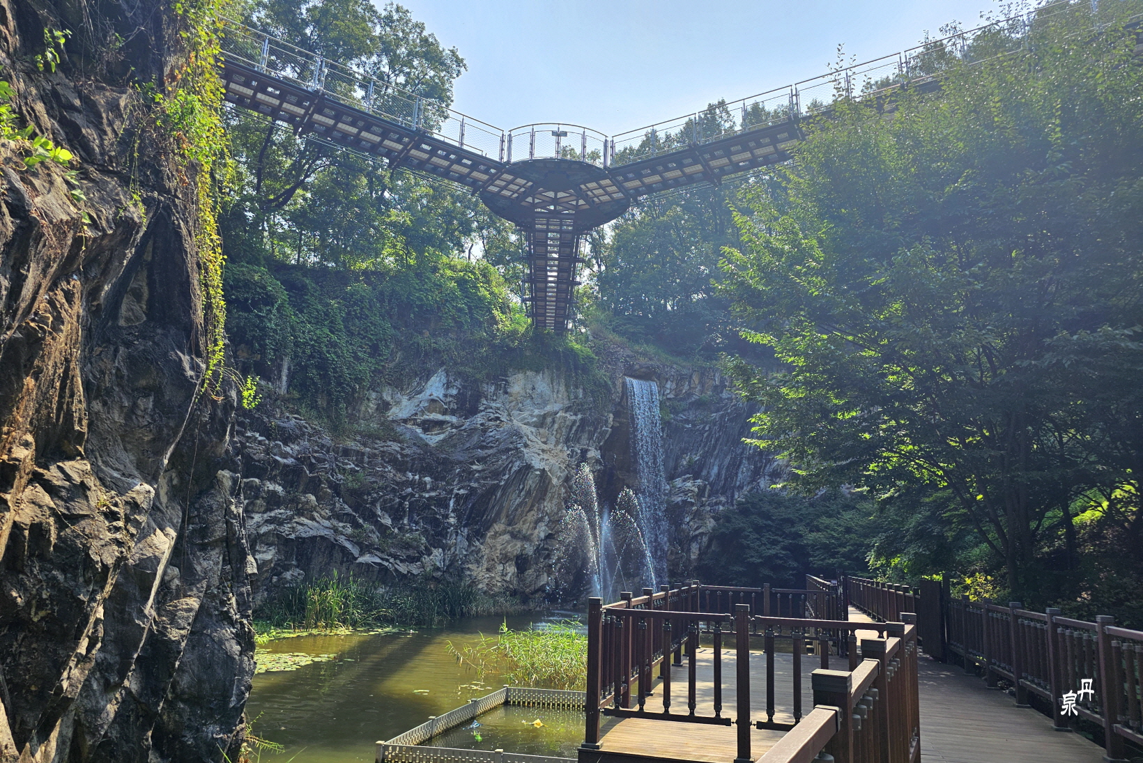 출렁다리 아래에는 멋진 인공폭포와 연못이 있다