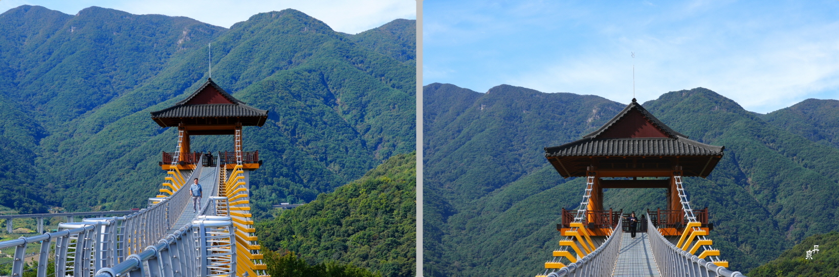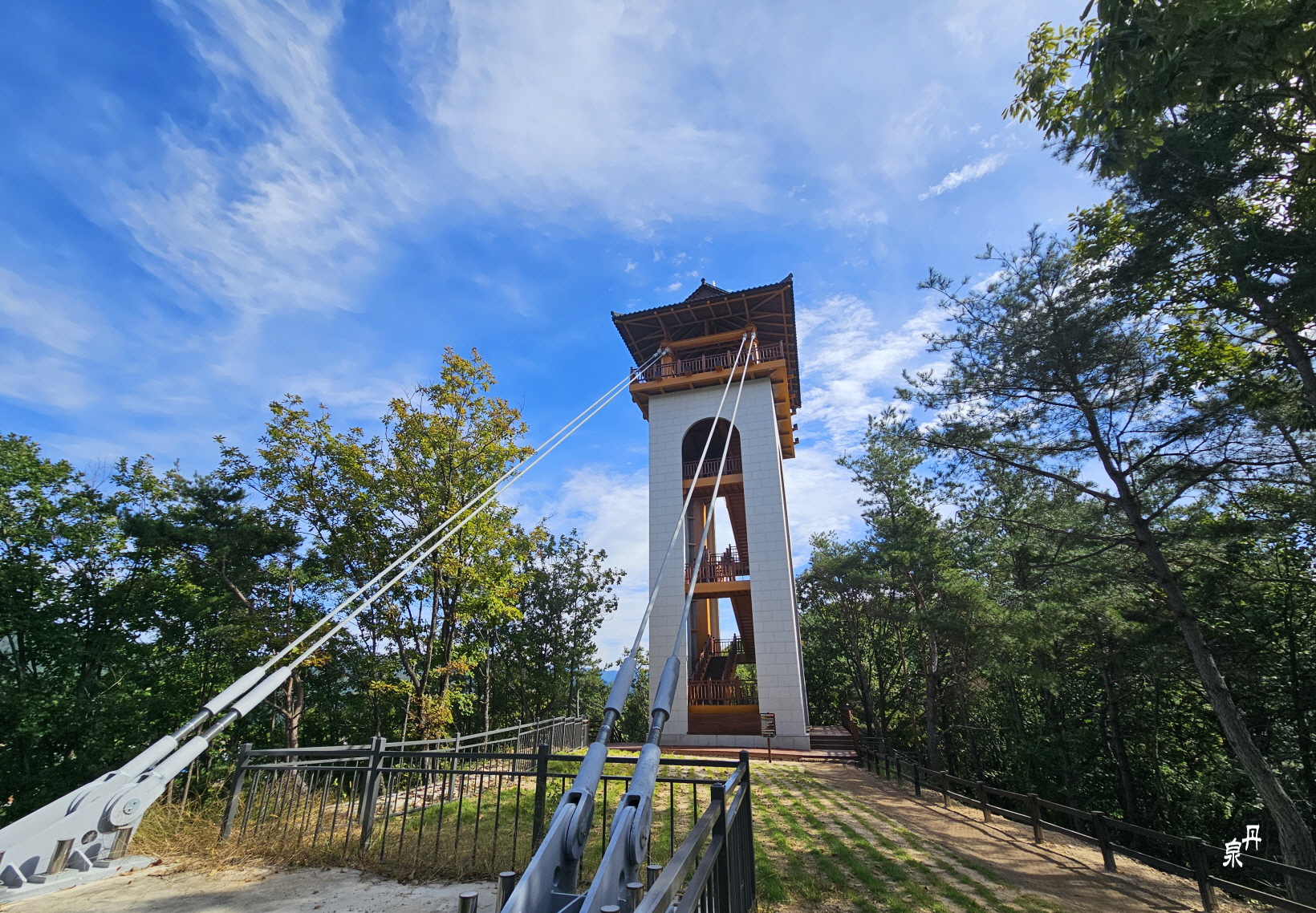 봉명산 출렁다리는 다른 곳과 달리 산 위에 탑을 세우고 그 속으로 들어가 계단을 오른 후에 건너가게 만들었다