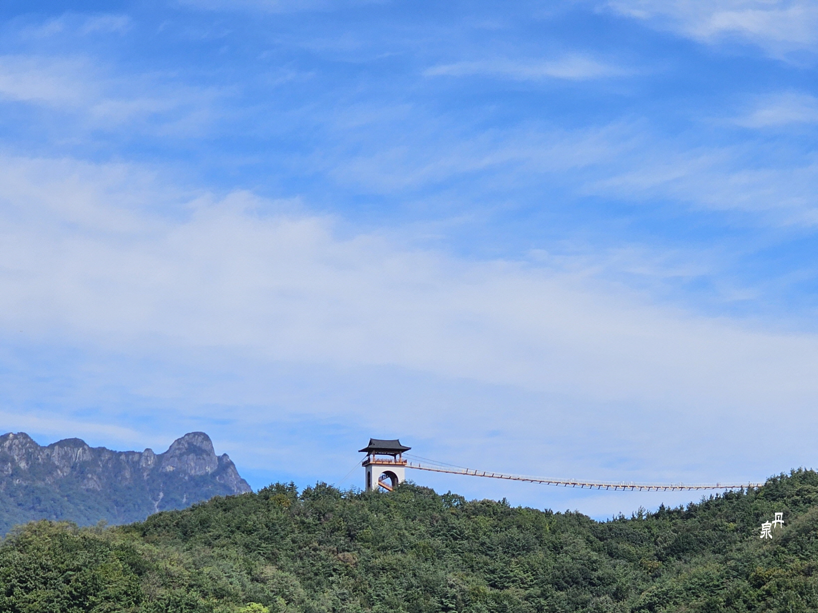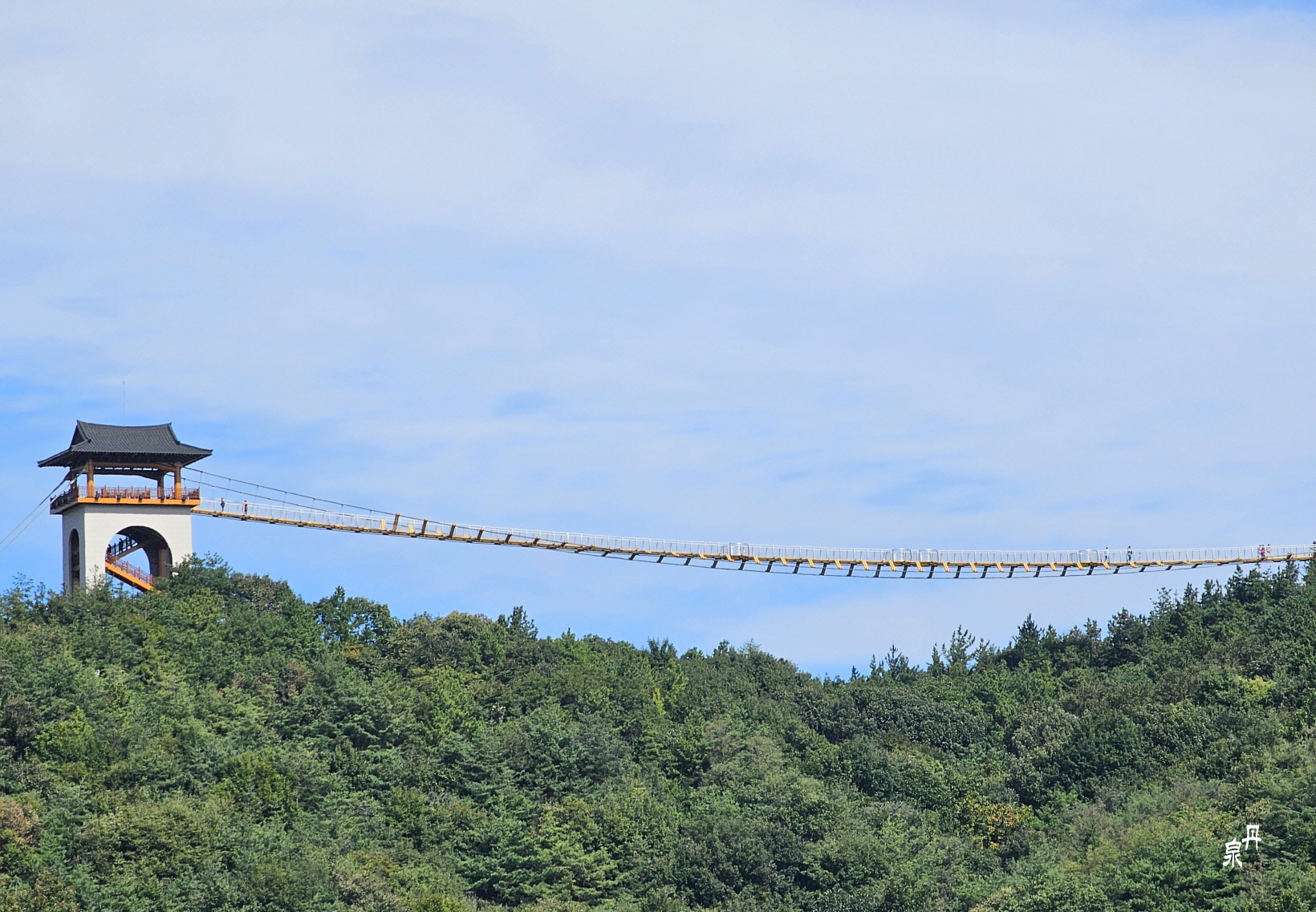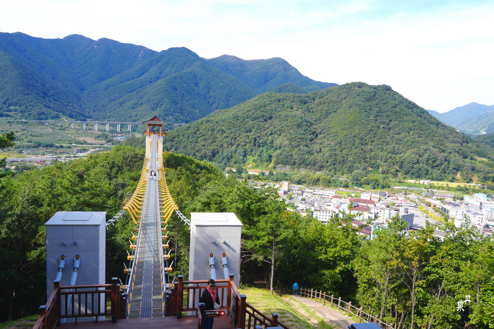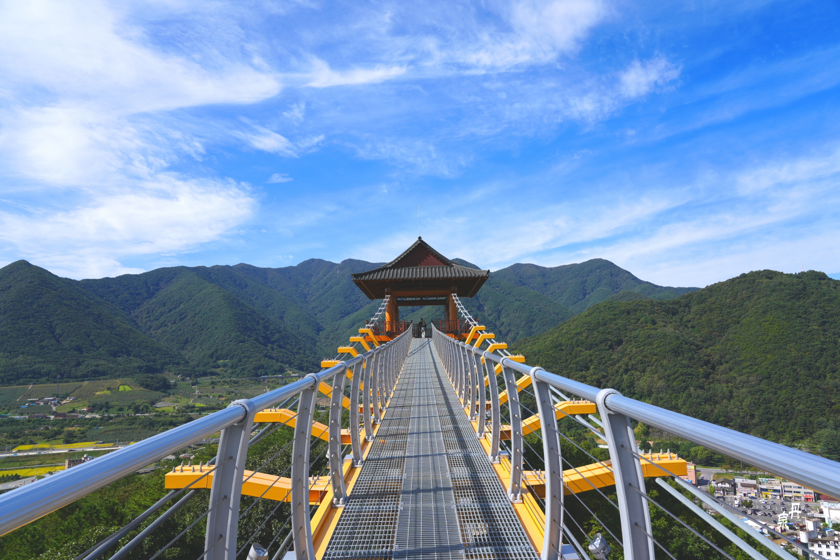 노란색 출렁다리가 푸른 자연과 파란 하늘이 잘 어울리는 문경 봉명산 출렁다리입니다