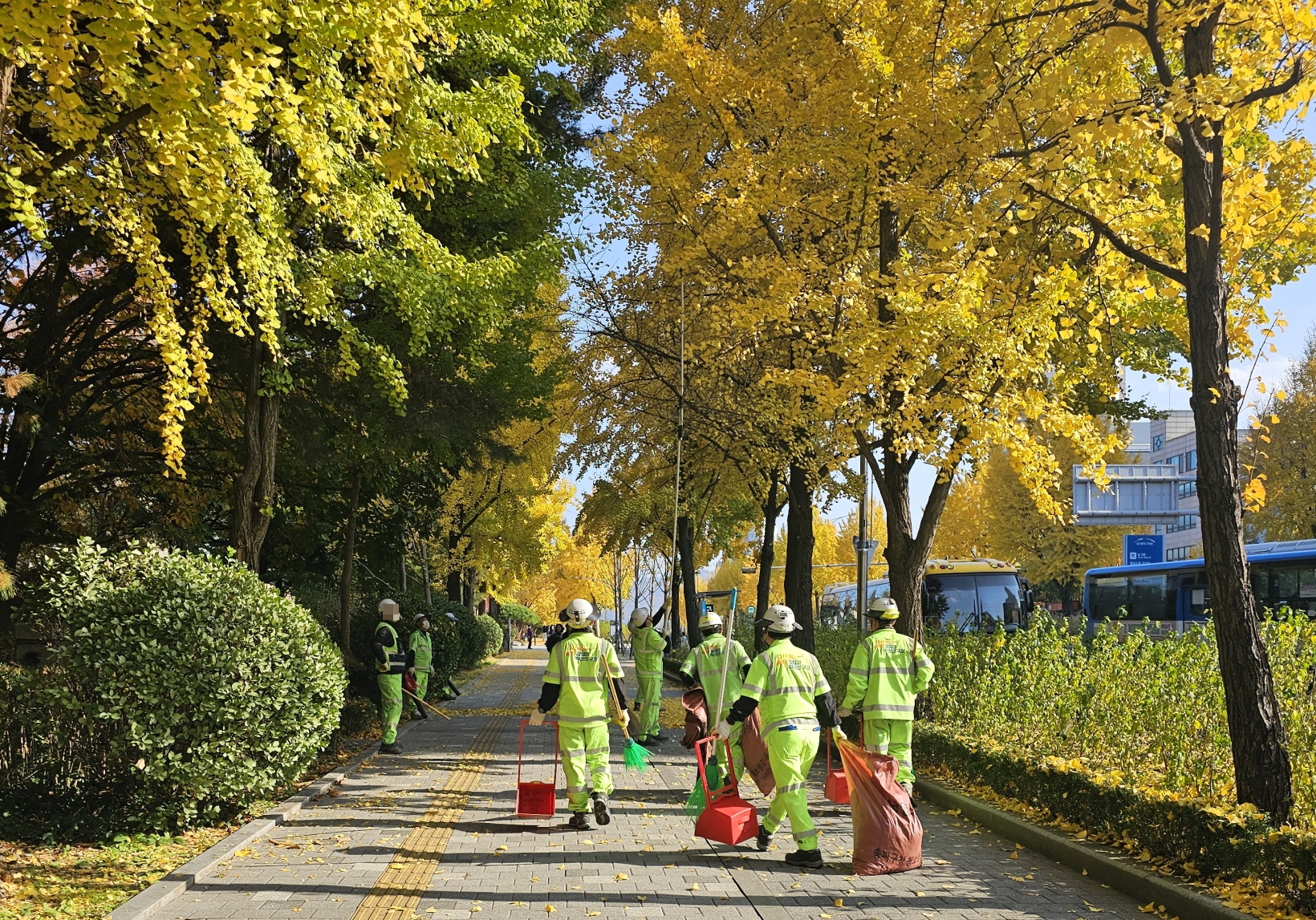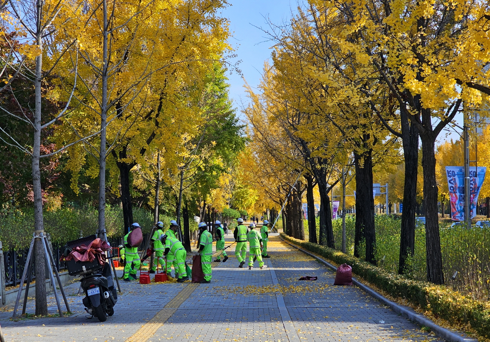 한쪽에서 청소하시는 분들이 떨어진 은행잎을 치우는 것은 물론이고 나무에 예쁘게 달려있는