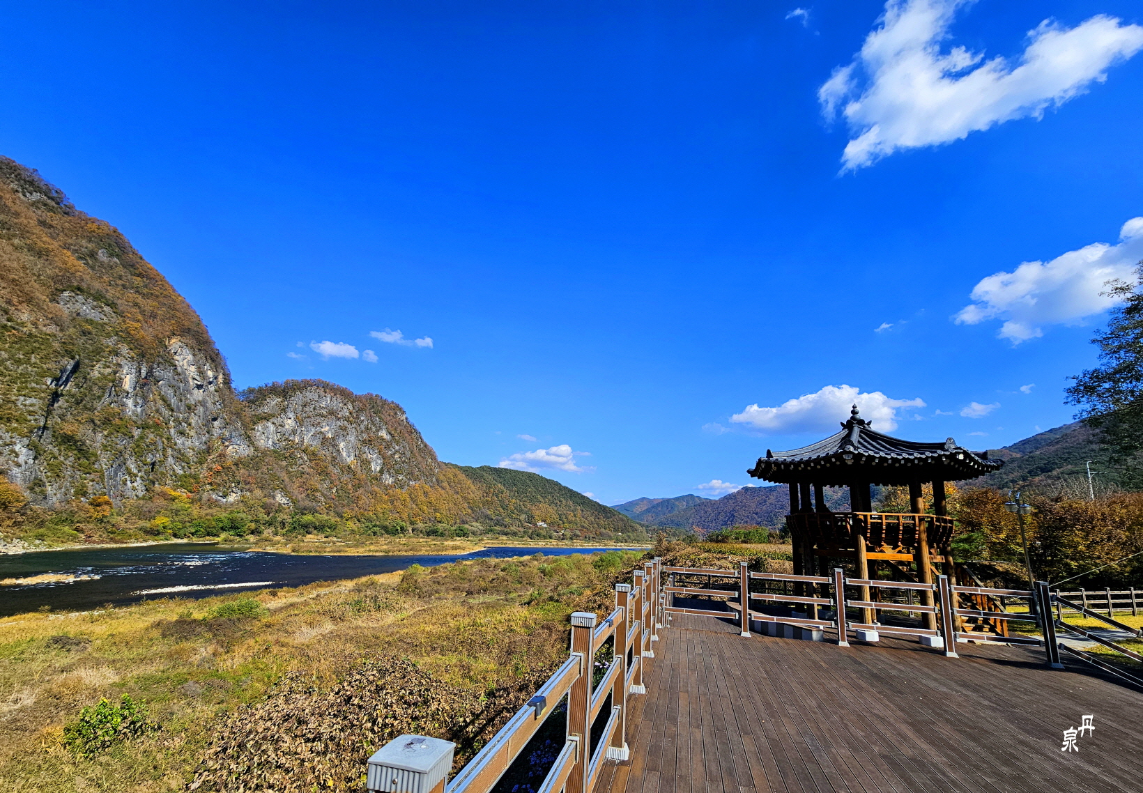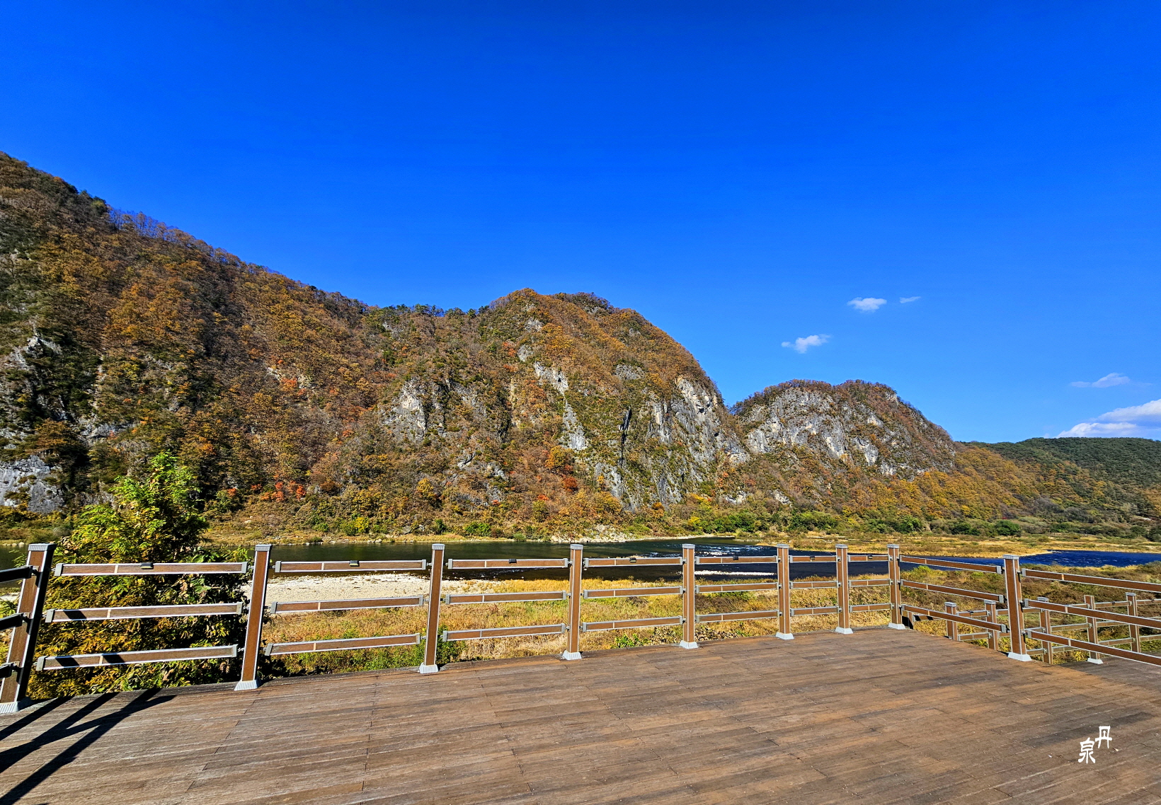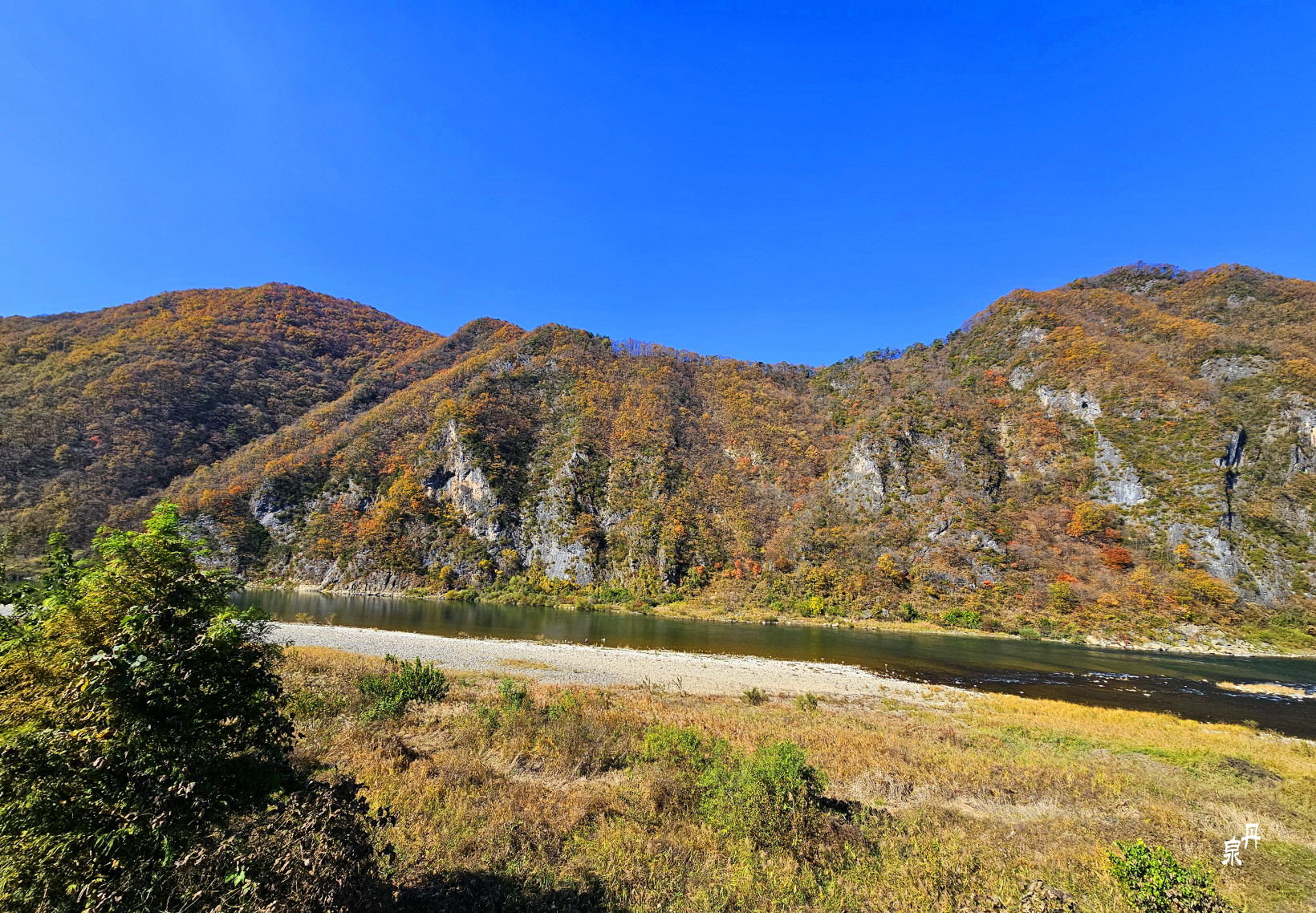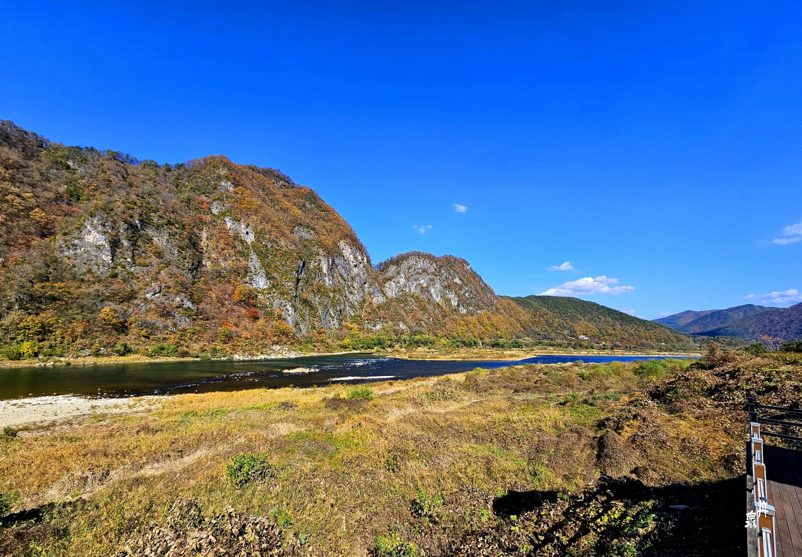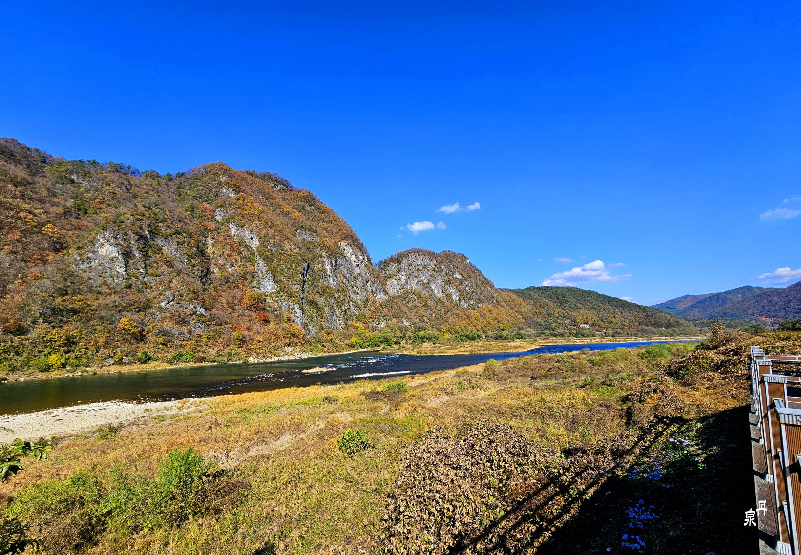 물 건너 바위 병풍에 단풍이 파노라마처럼 펼쳐진다