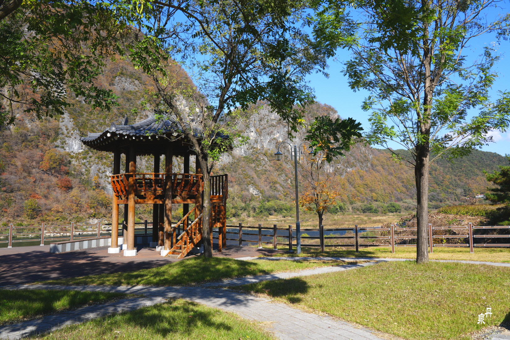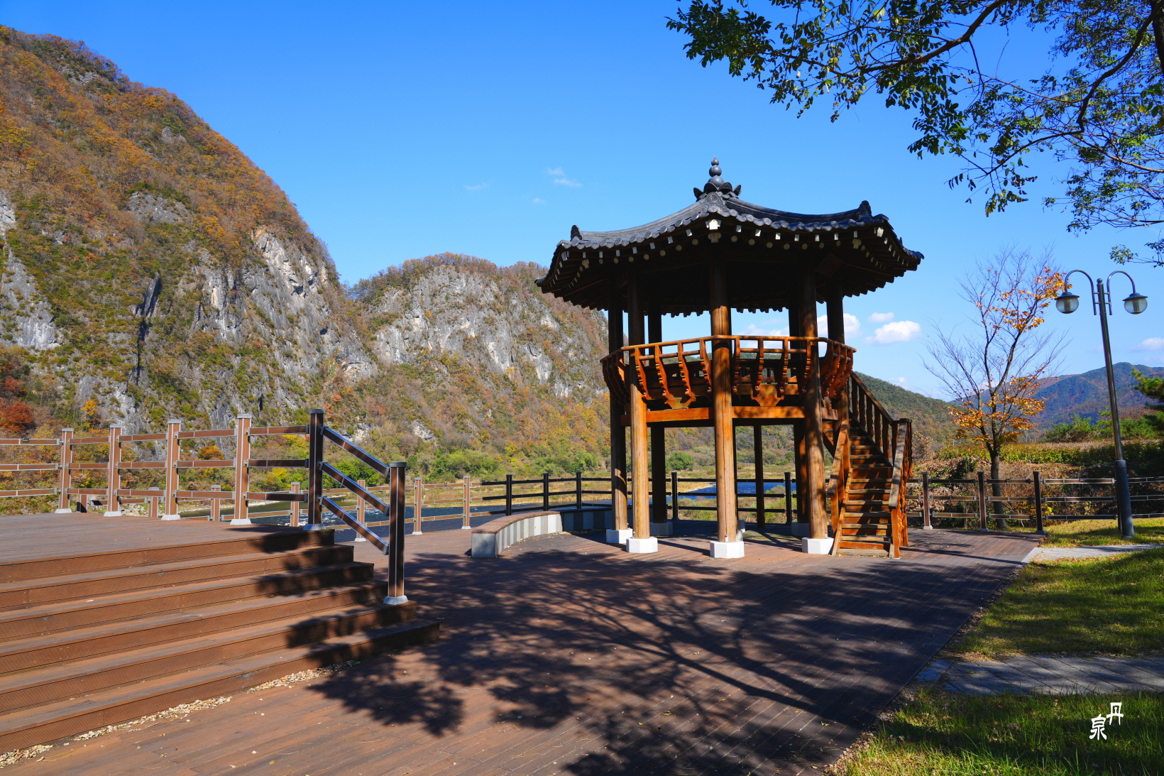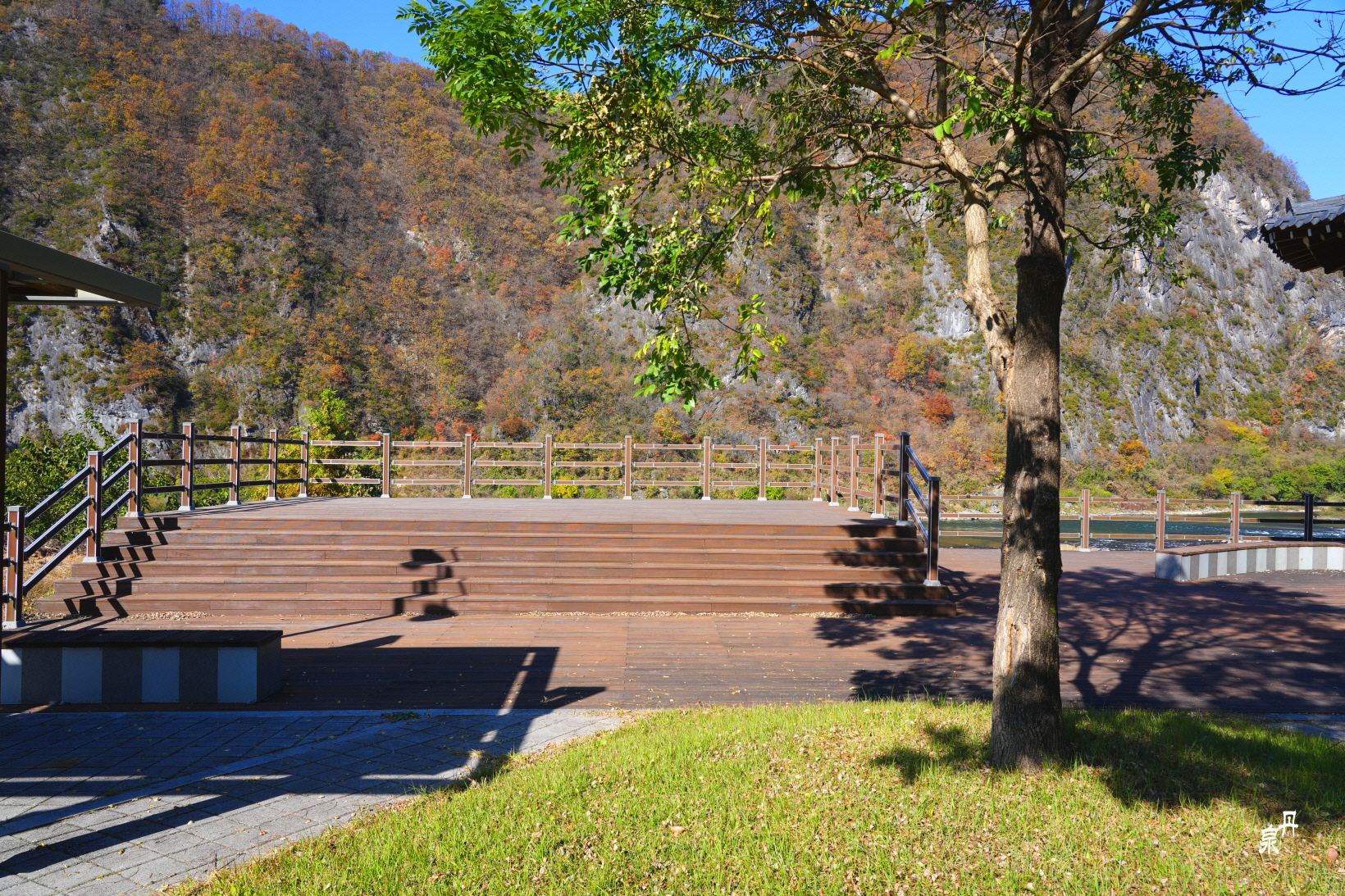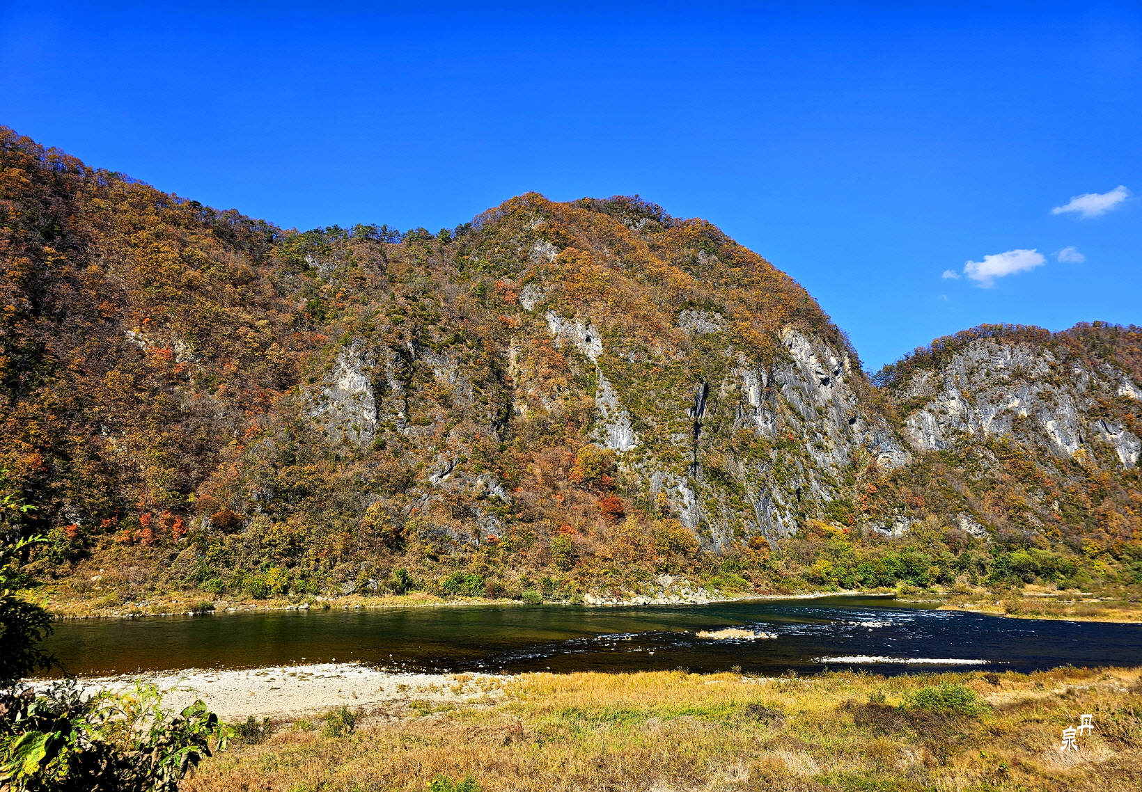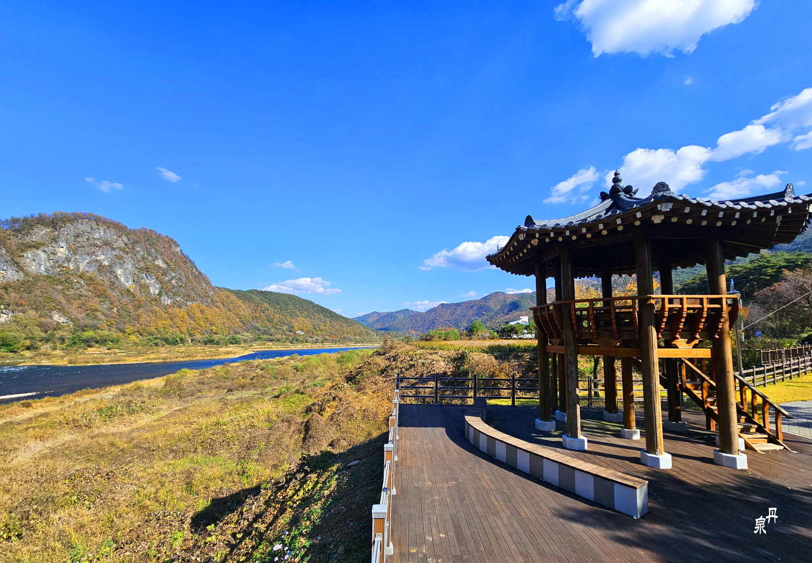 물 건너 바위 병풍에 단풍이 파노라마처럼 펼쳐진다