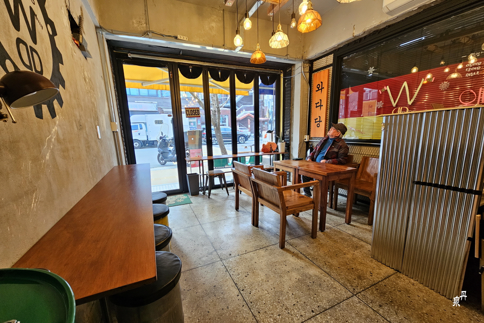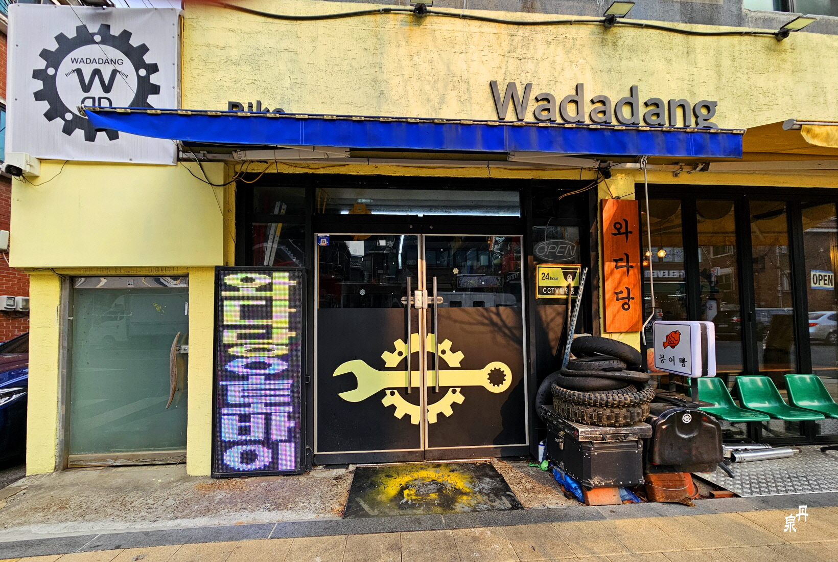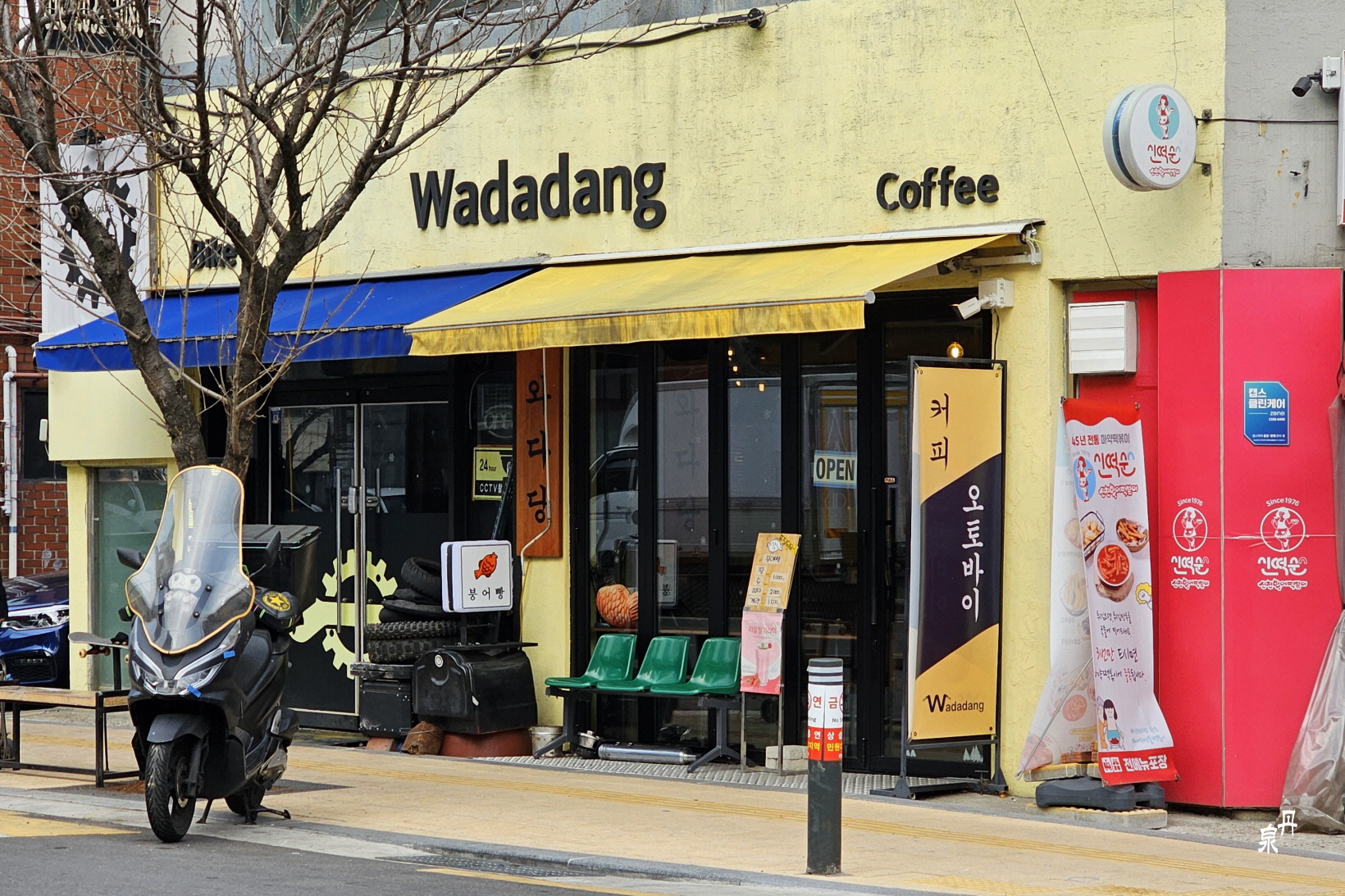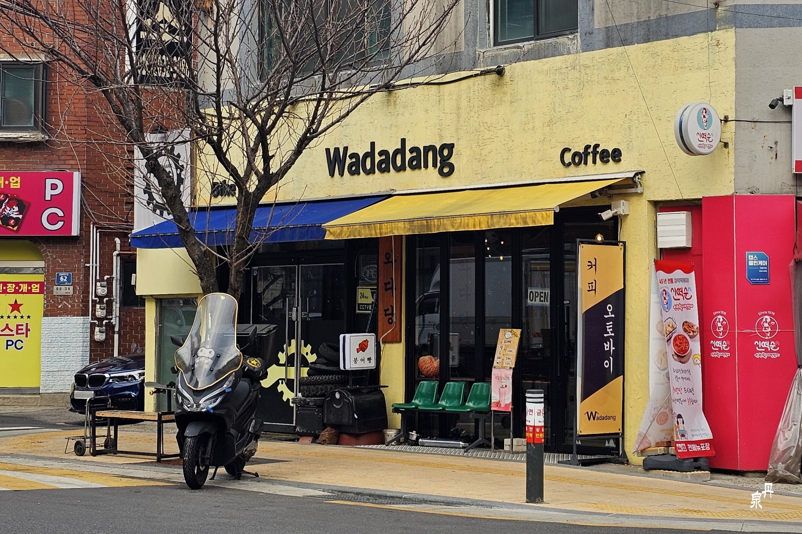 궁금하여 길을 건너가 보니 작은 카페인데 옆집은 오토바이 수리점이고 간판은 하나 와다당이다