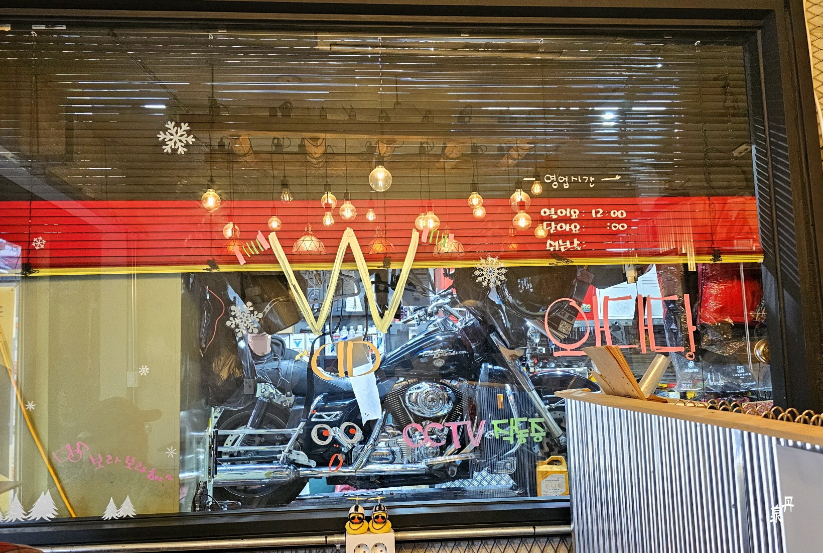 카페 한쪽 벽의 블라인드를 올리니 옆집 오토바이 수리점이 보이는데