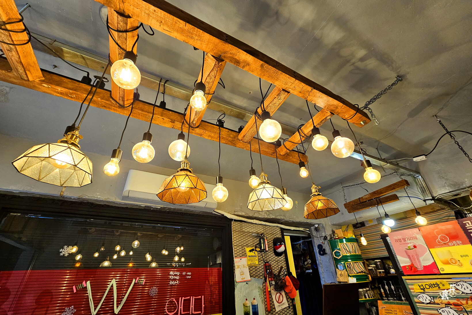천정에 따스한 불빛의 노출 조명이 포근하게 느껴진다