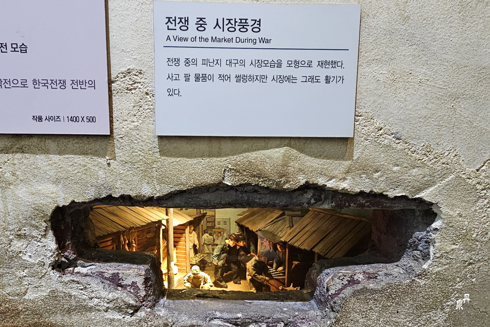 구멍 난 벽 넘어 보이는 전쟁 중 시장풍경인데 재미있게 잘 만들었다