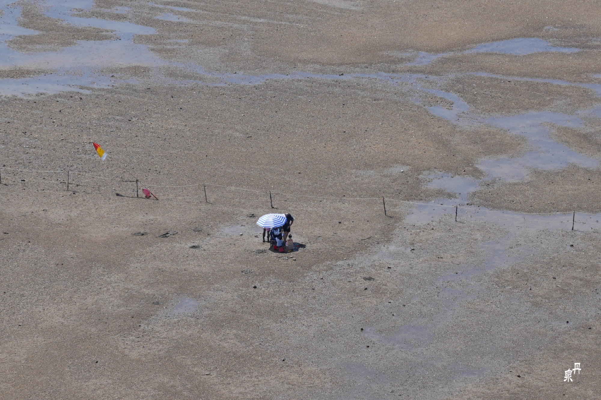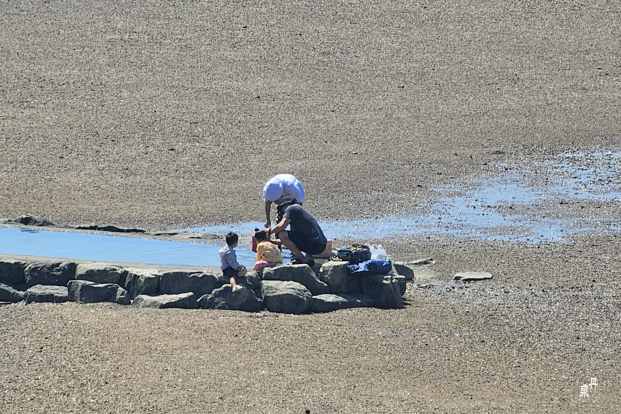 어린이가 포함된 한가족이 뜨거운 태양 아래 비치파라솔 속에서 옹기종기 갯벌 체험을 하고 있다