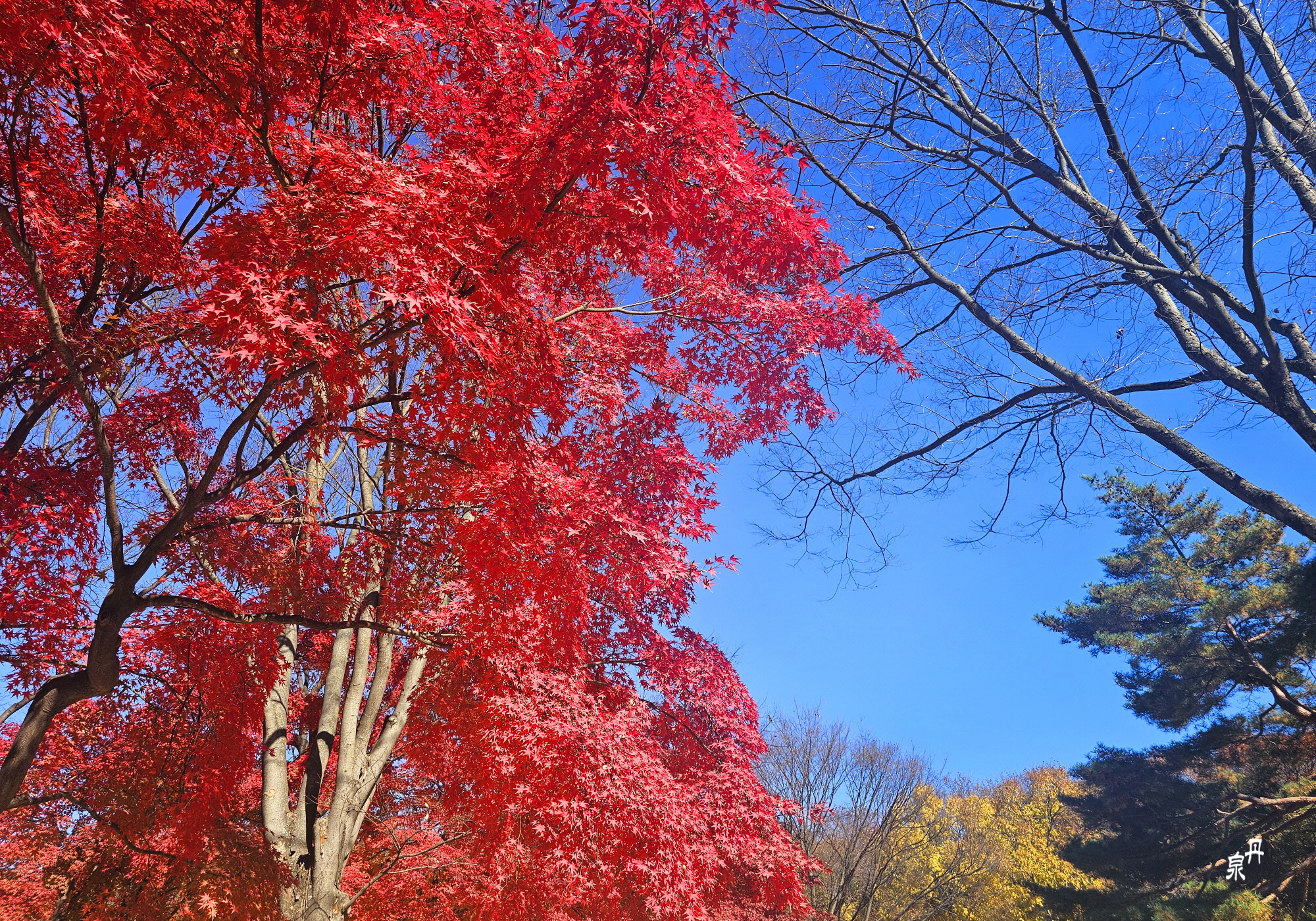 사방에 단풍이 들어 울긋불긋 세상인데 이 나무는 홀로 독야청청하며 눈길을 끈다