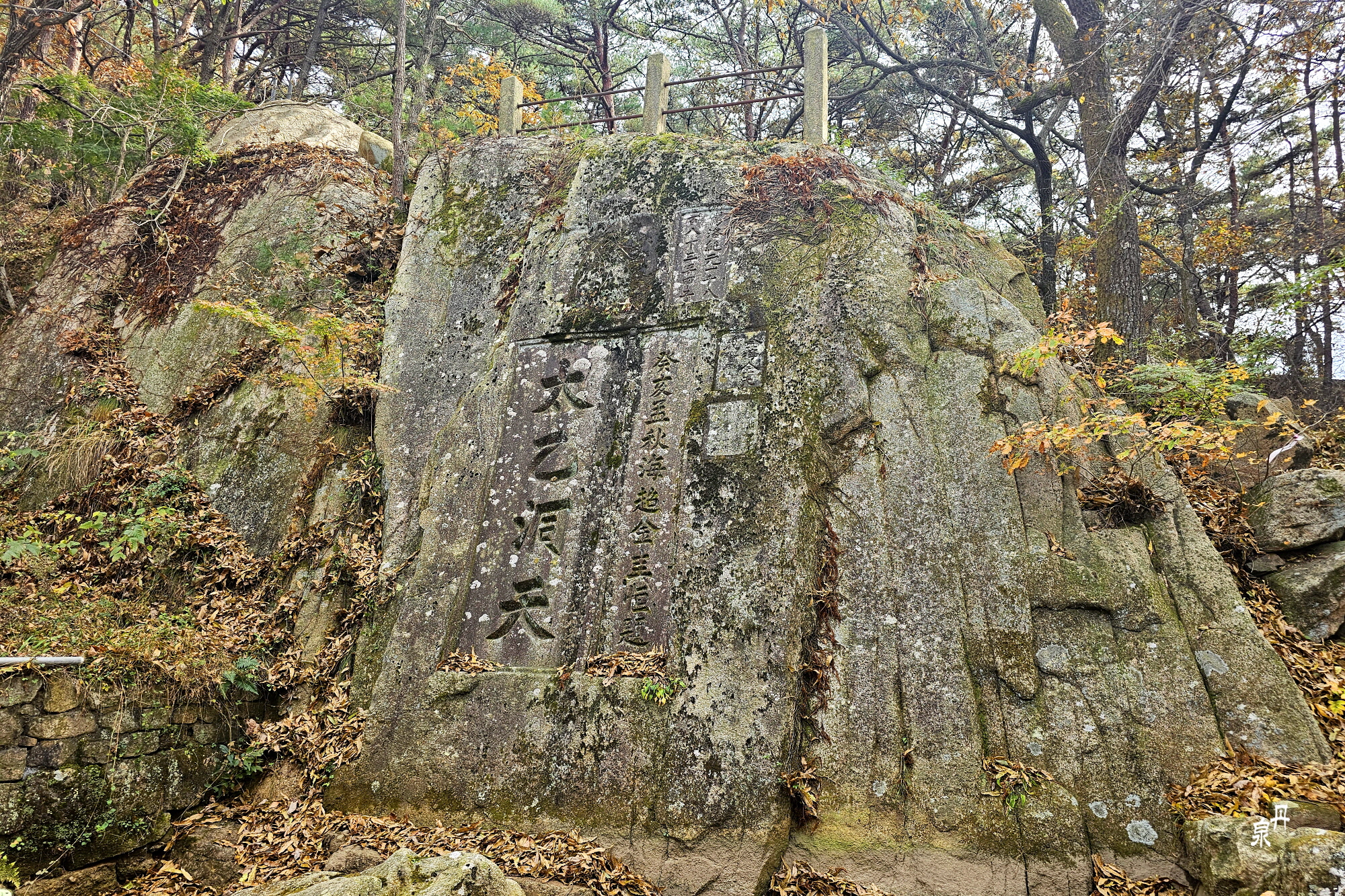 백화산 정상에 있는 쌍괴대, 1902년 태안군수 이기석이 두 그루의 회화나무를 심은 것을 기념하여 새긴 바위