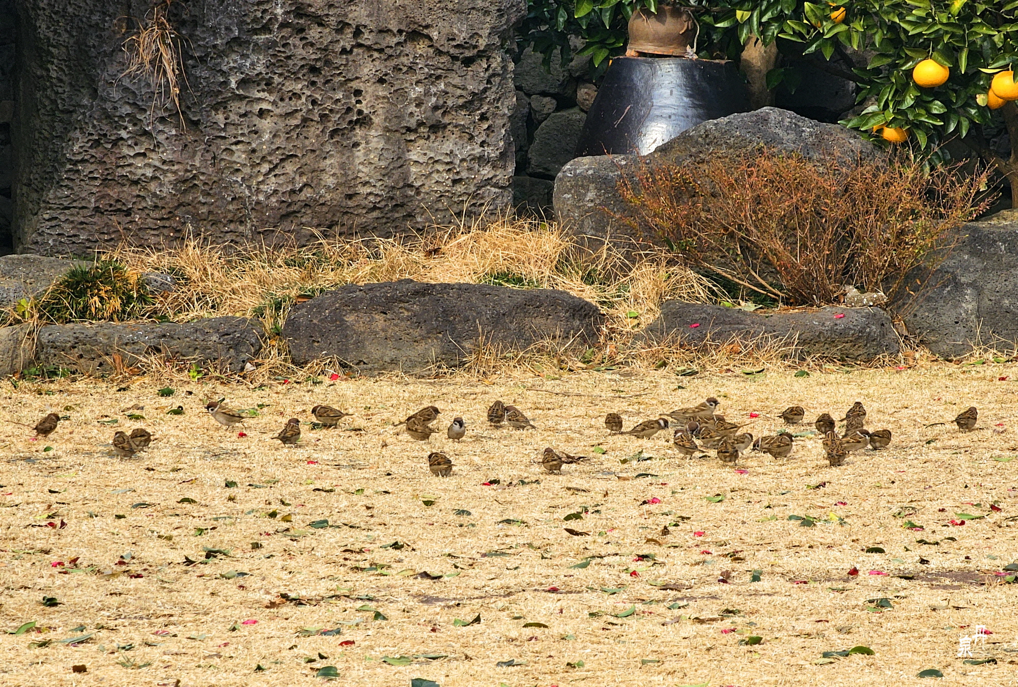 마당에 무었이 있는지 참새들이 사람들이 오면 도망갔다 없으면 내려와 먹이를 찾는다