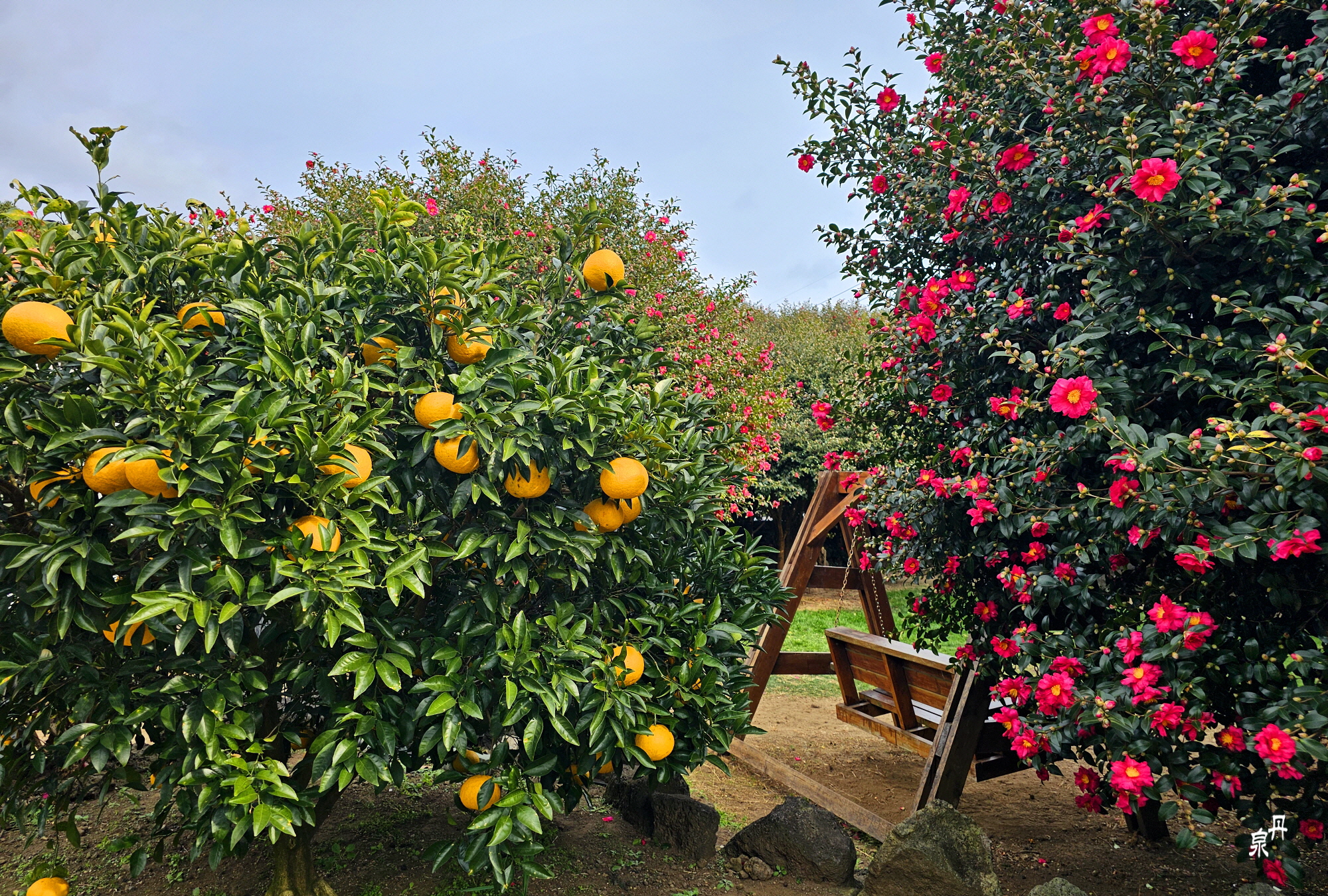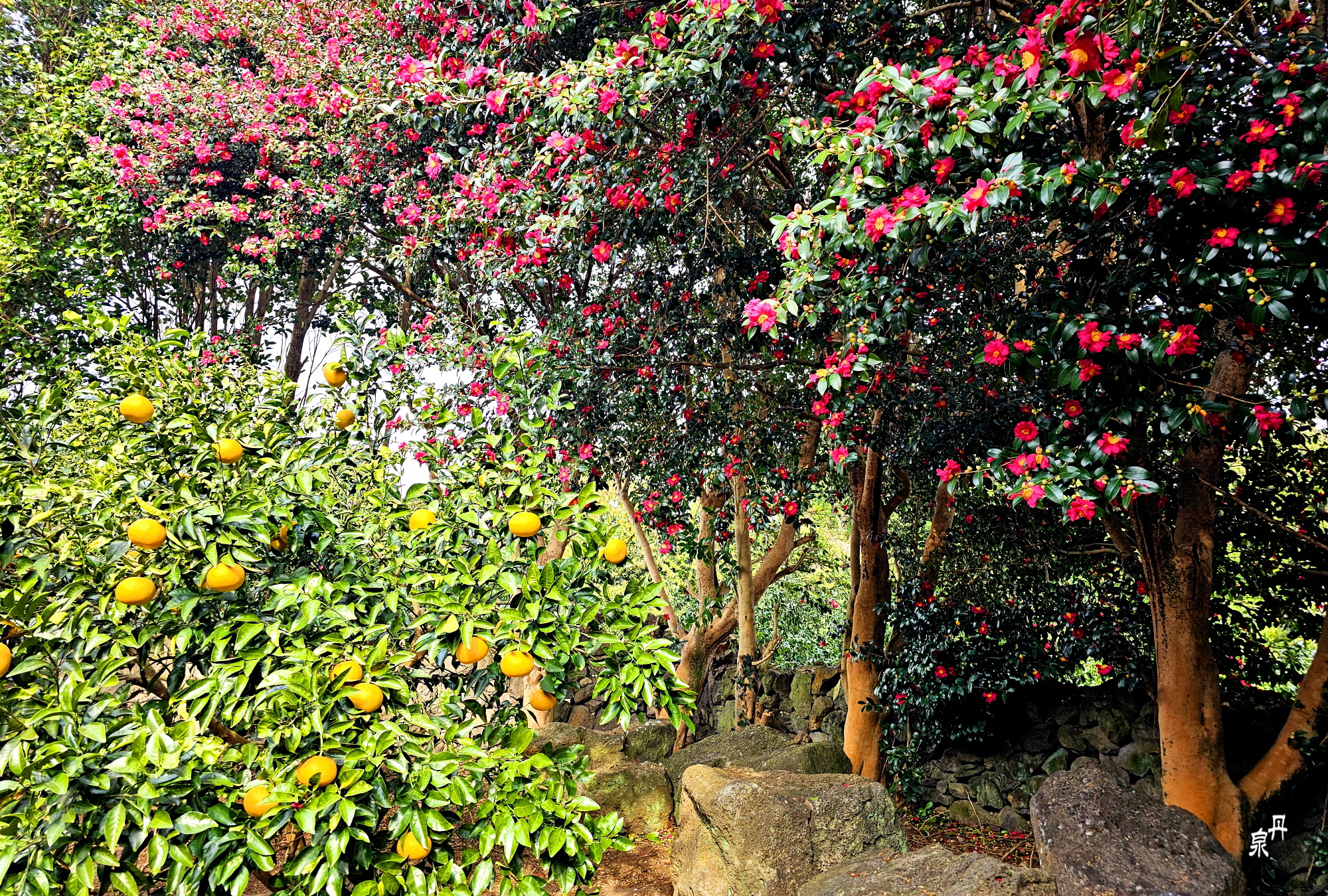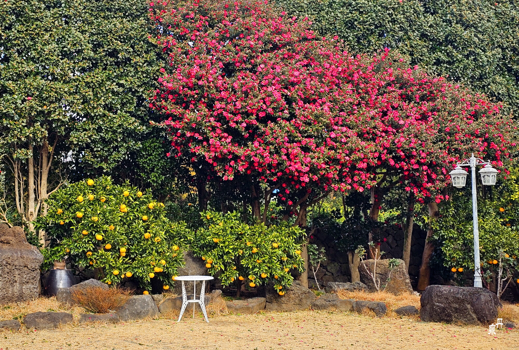 붉은 동백꽃과 노란 귤이 이곳이 제주도라고 말 하는 것 같다