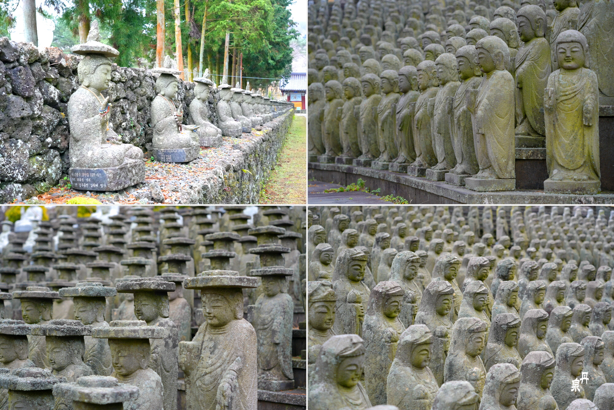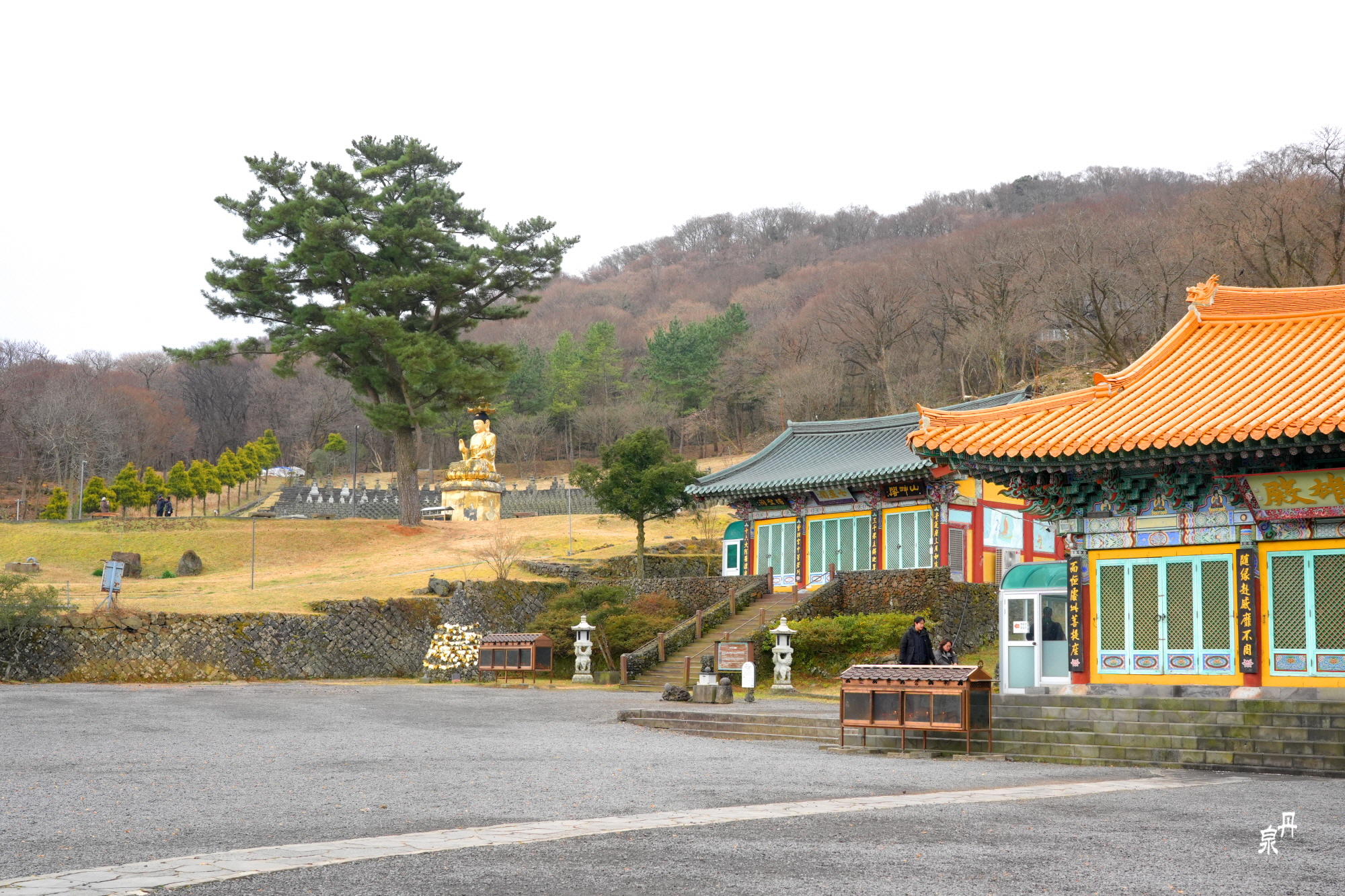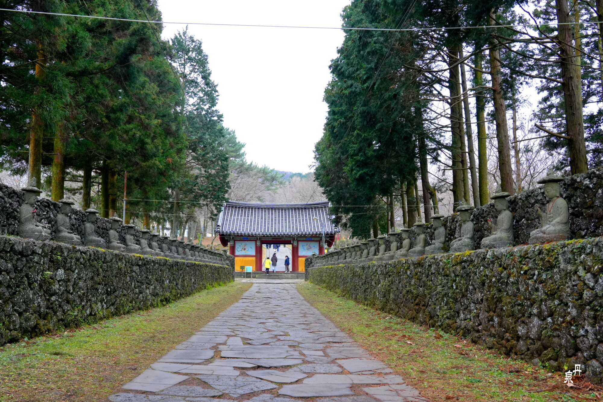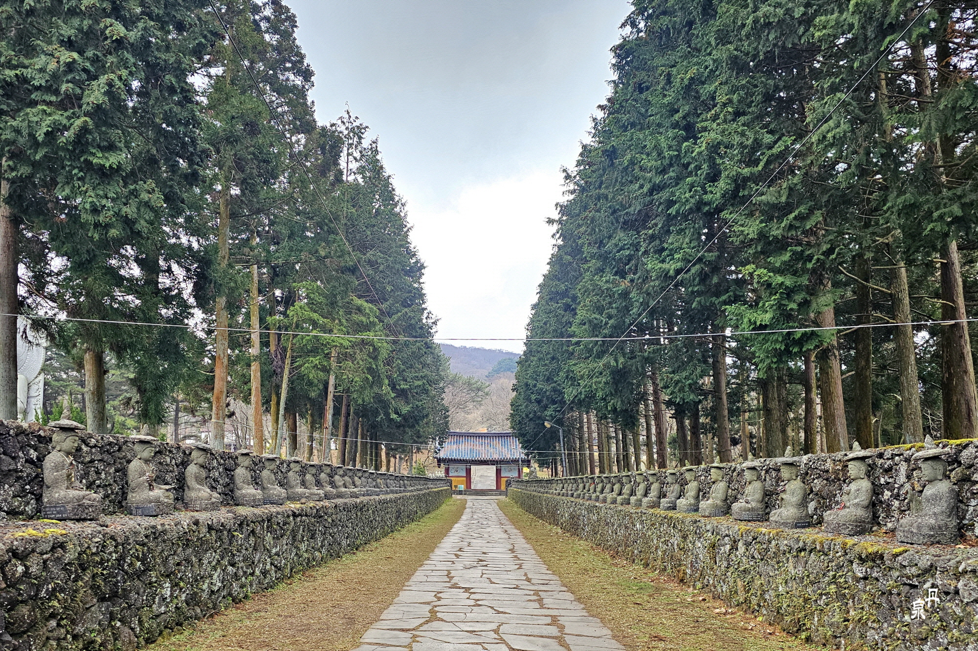 일주문에서 대웅전까지 이어진 곧은길 양쪽에 삼나무가 숲을 이루고 108 석불이 도열하여 멋지고 장엄한 분위기를 보여준다