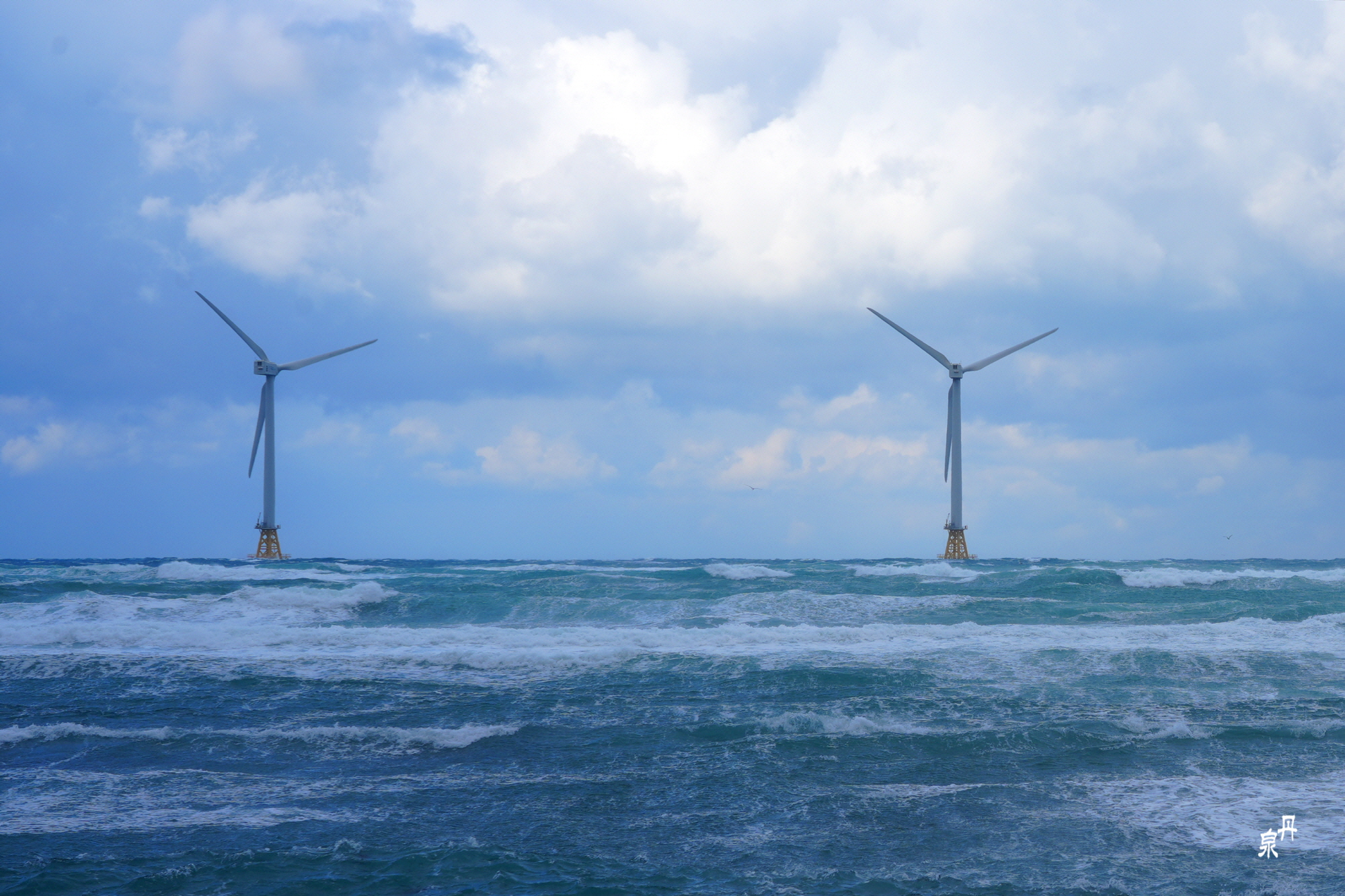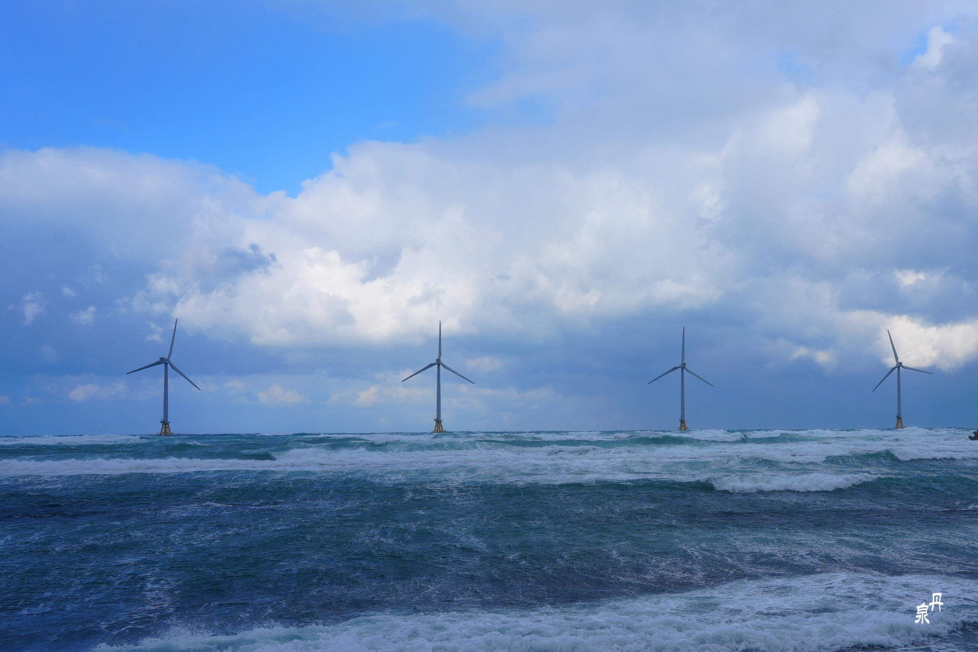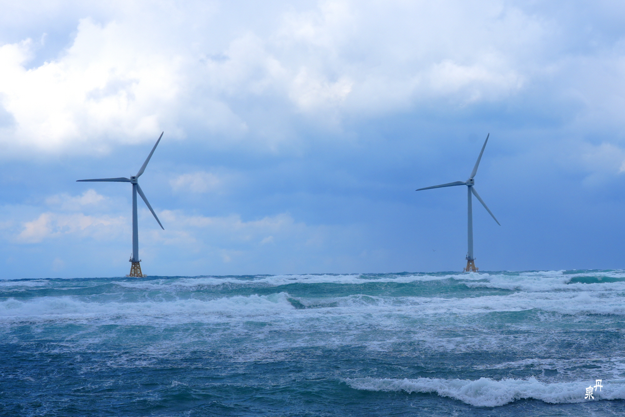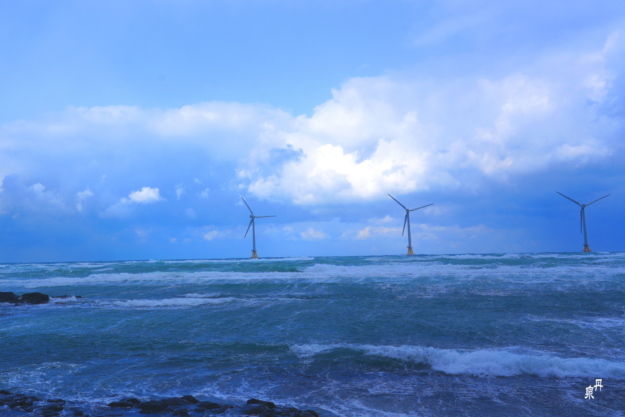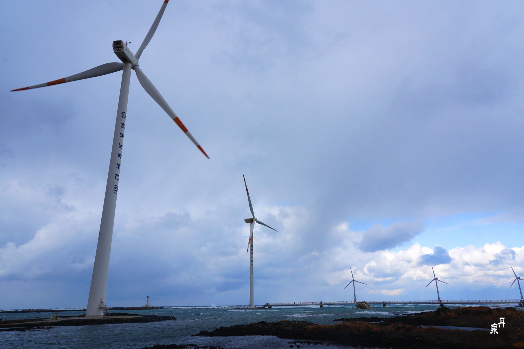 바람 불어 좋은 날 제주도 신창 바닷가에 전기를 생산하는 풍차가 힘차게 돌고 있습니다
