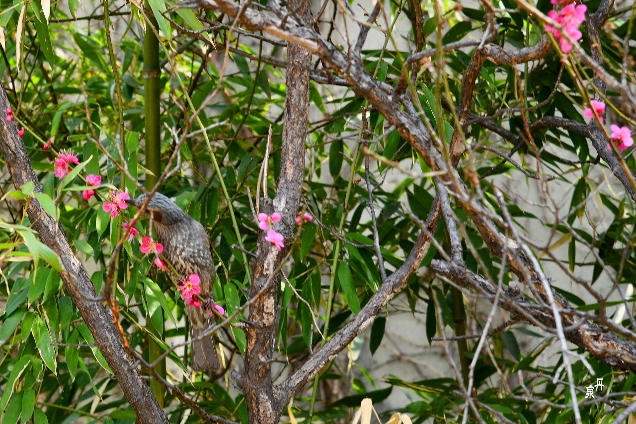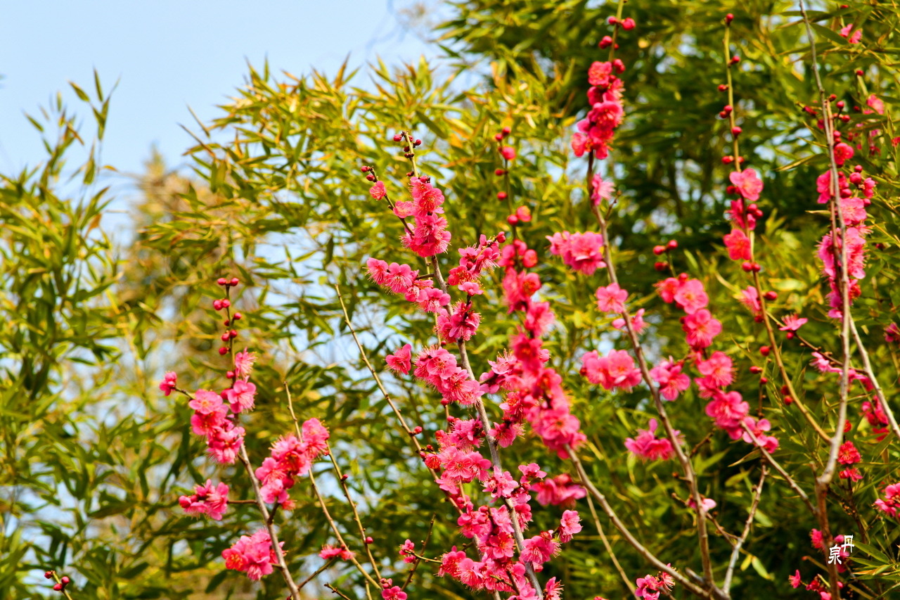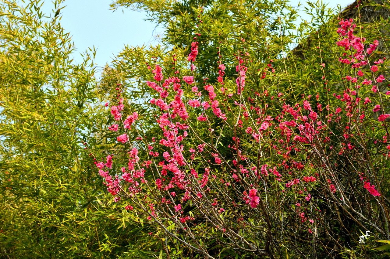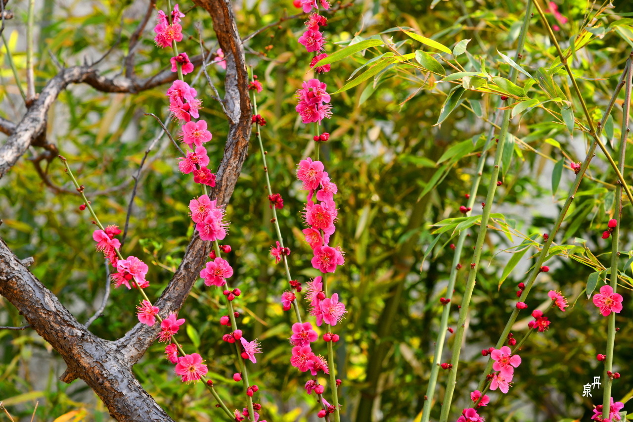 대나무 사이에 홍매화도 몇 그루 있어 자태를 뽐낸다