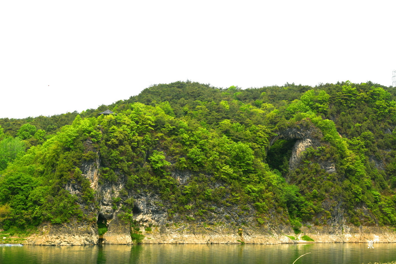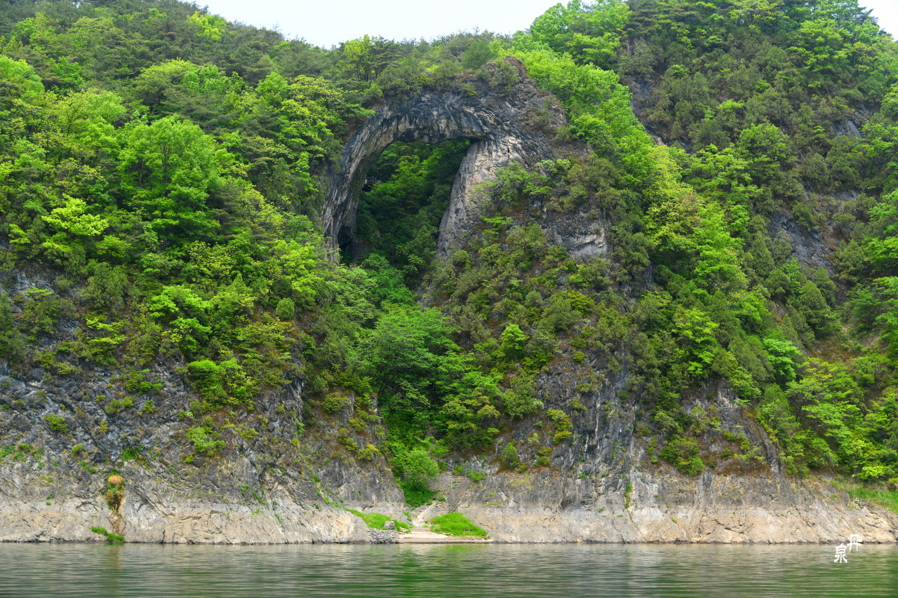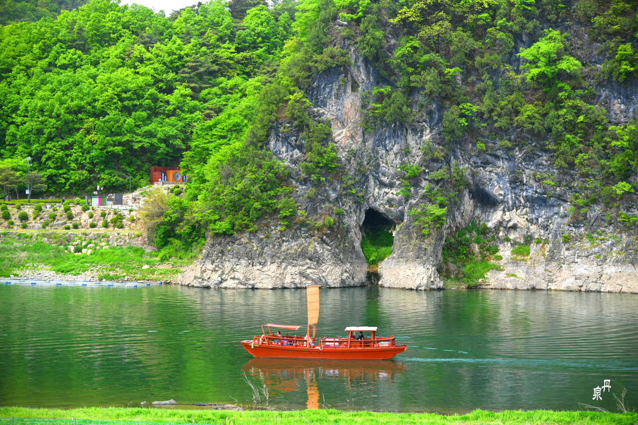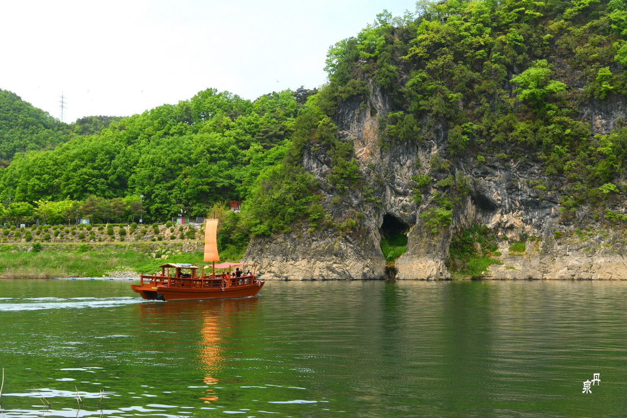 도담삼봉에서 300m 정도 강으로 올라가면 무지개 모양의 석주가 보인다
