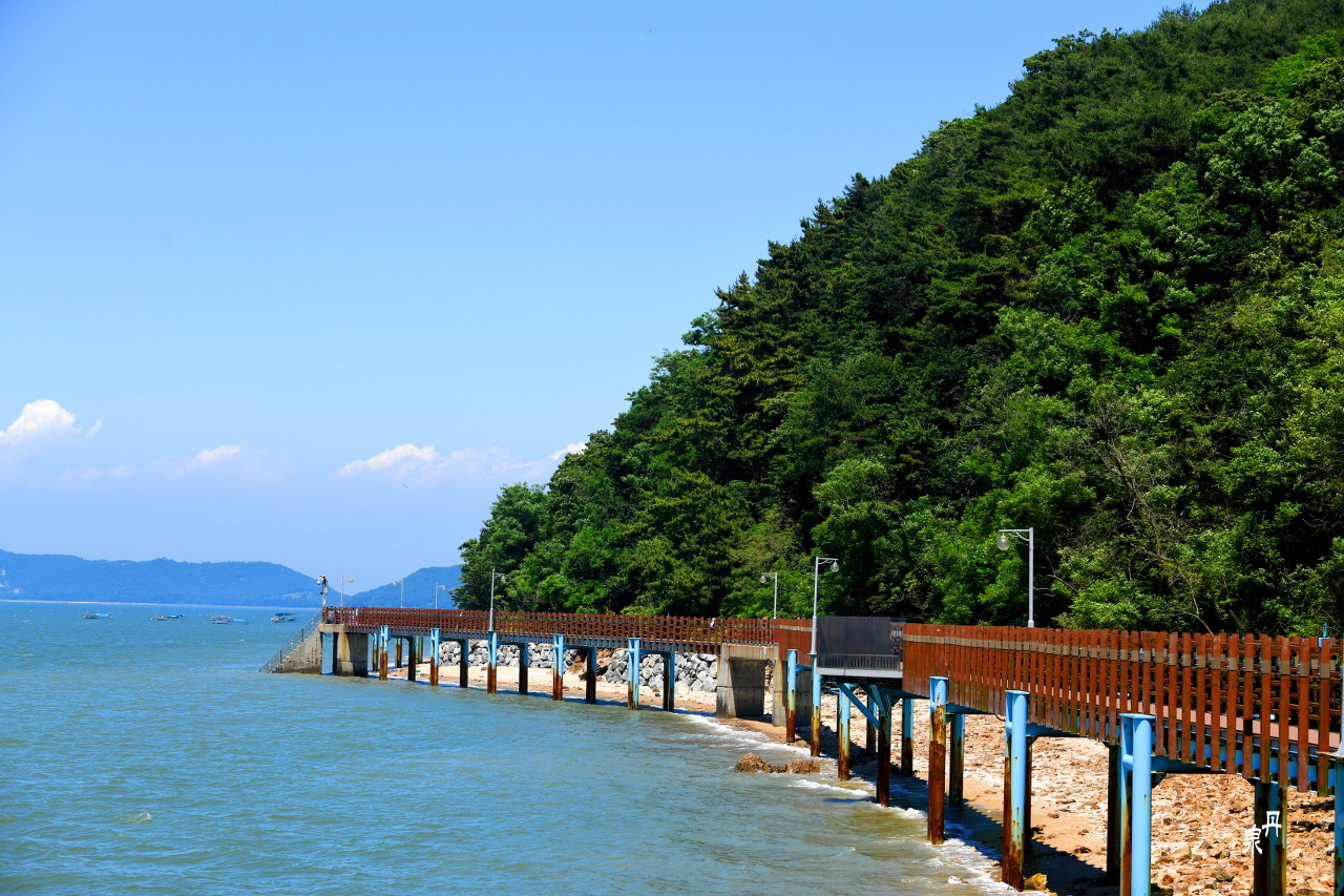 해변 테크 길 그리고 옆의 산이 해발 66.8 m 탑 재산이다