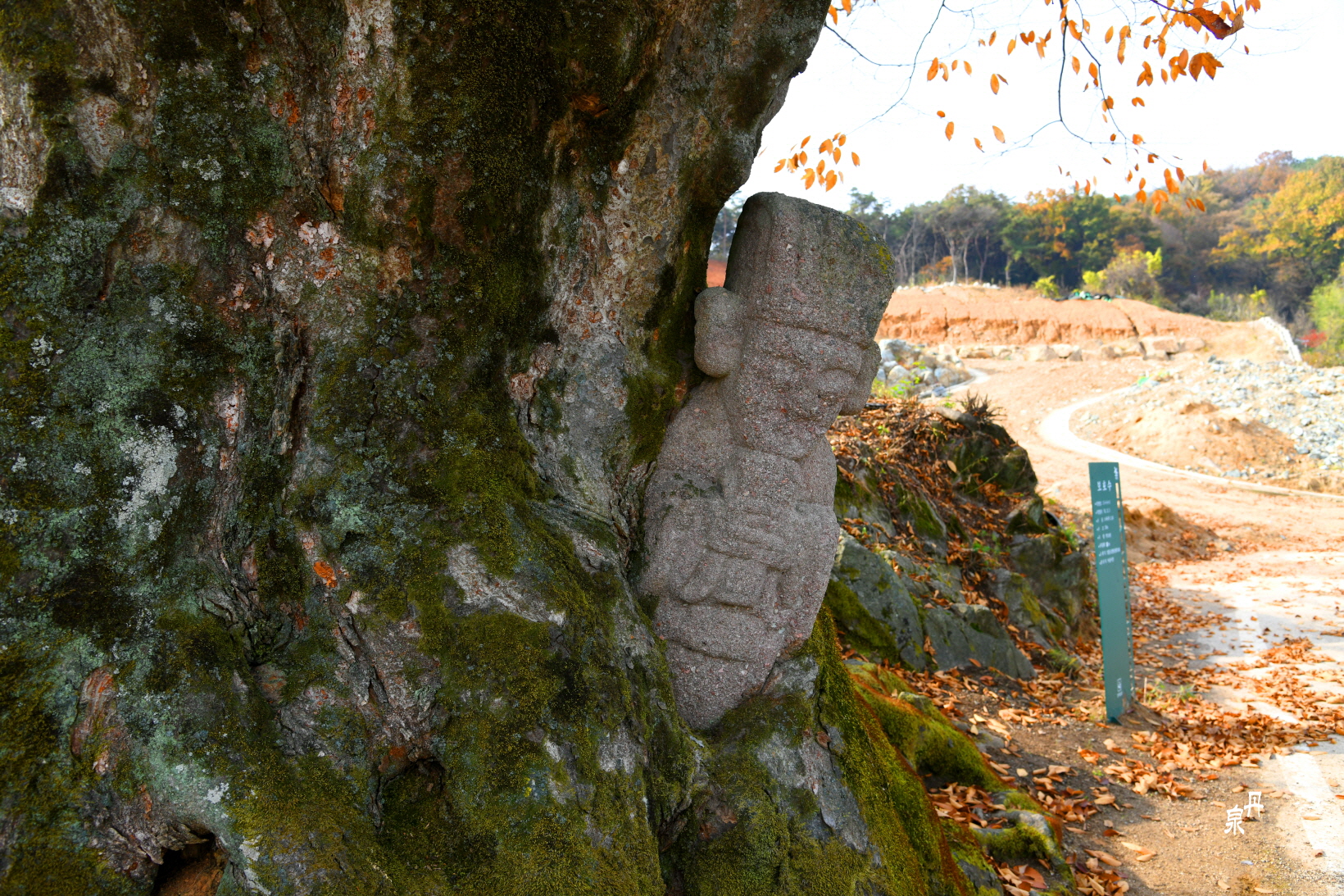 석상(石像)이 나무 품에 안겨 있다