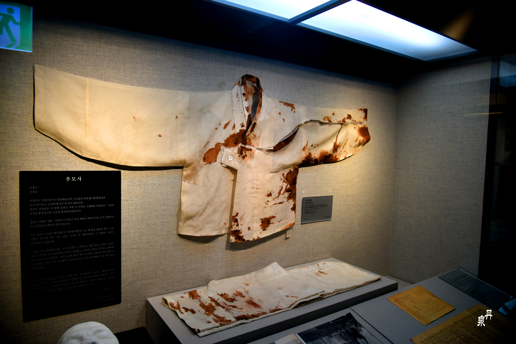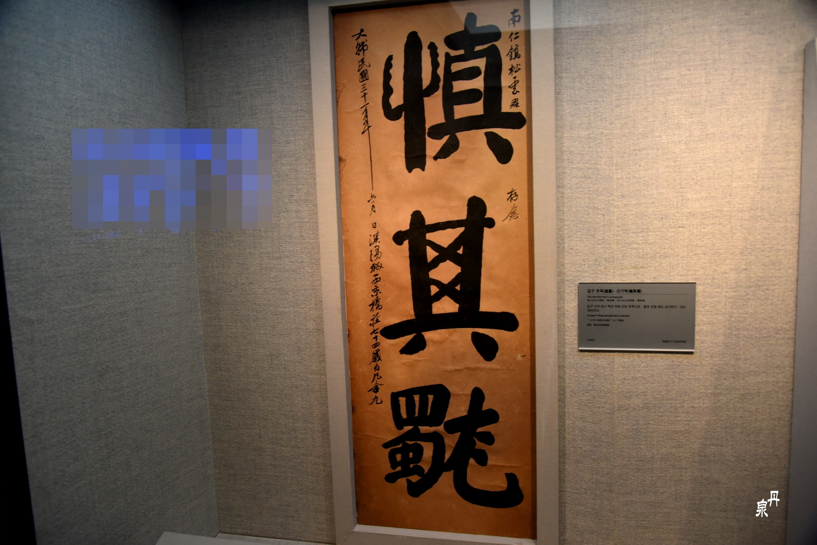 서거 당시 책상 위에 있던 유묵 두루마리 모서리의 선생의 피 자국이 있다