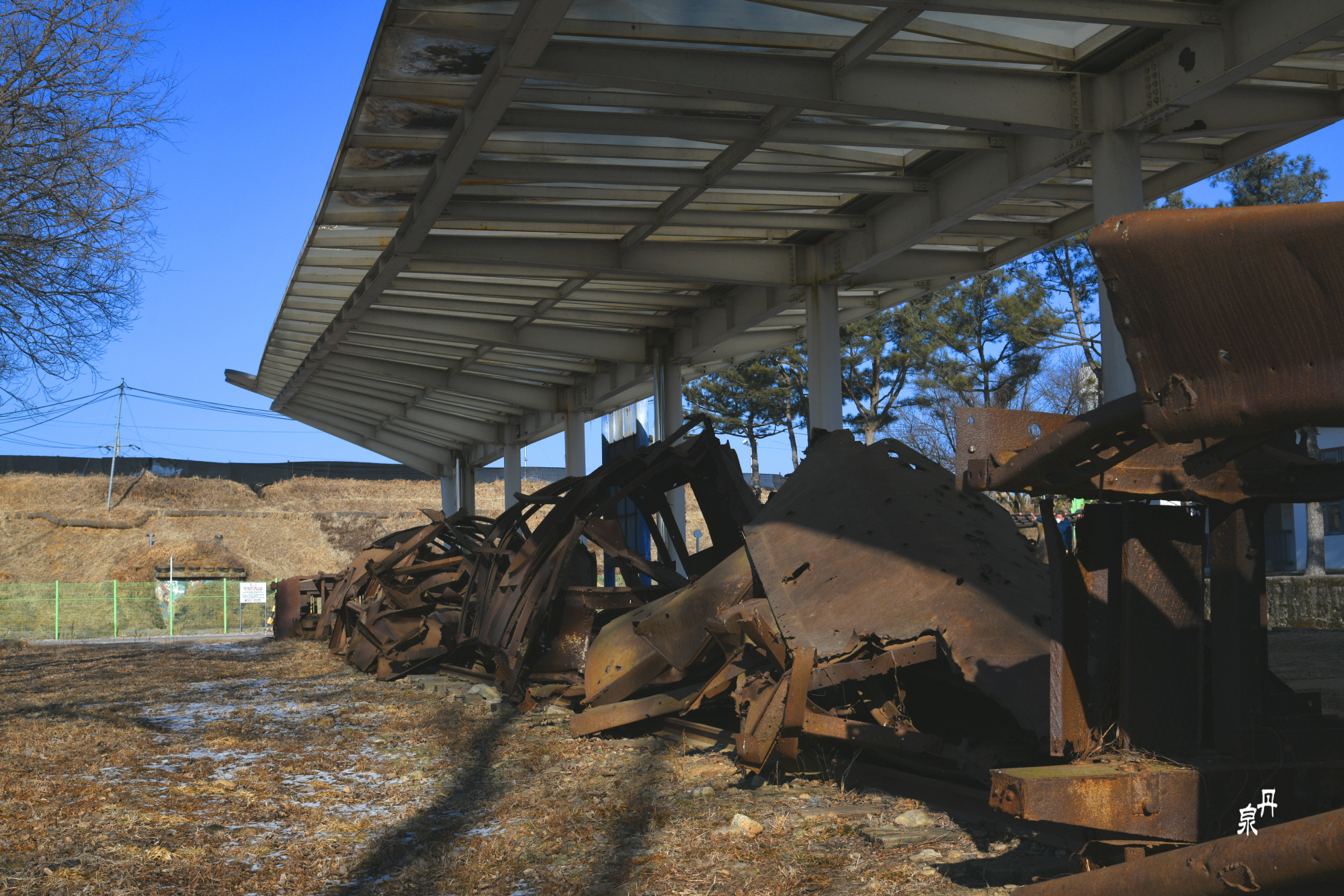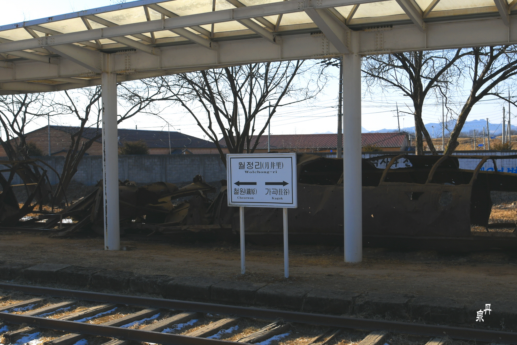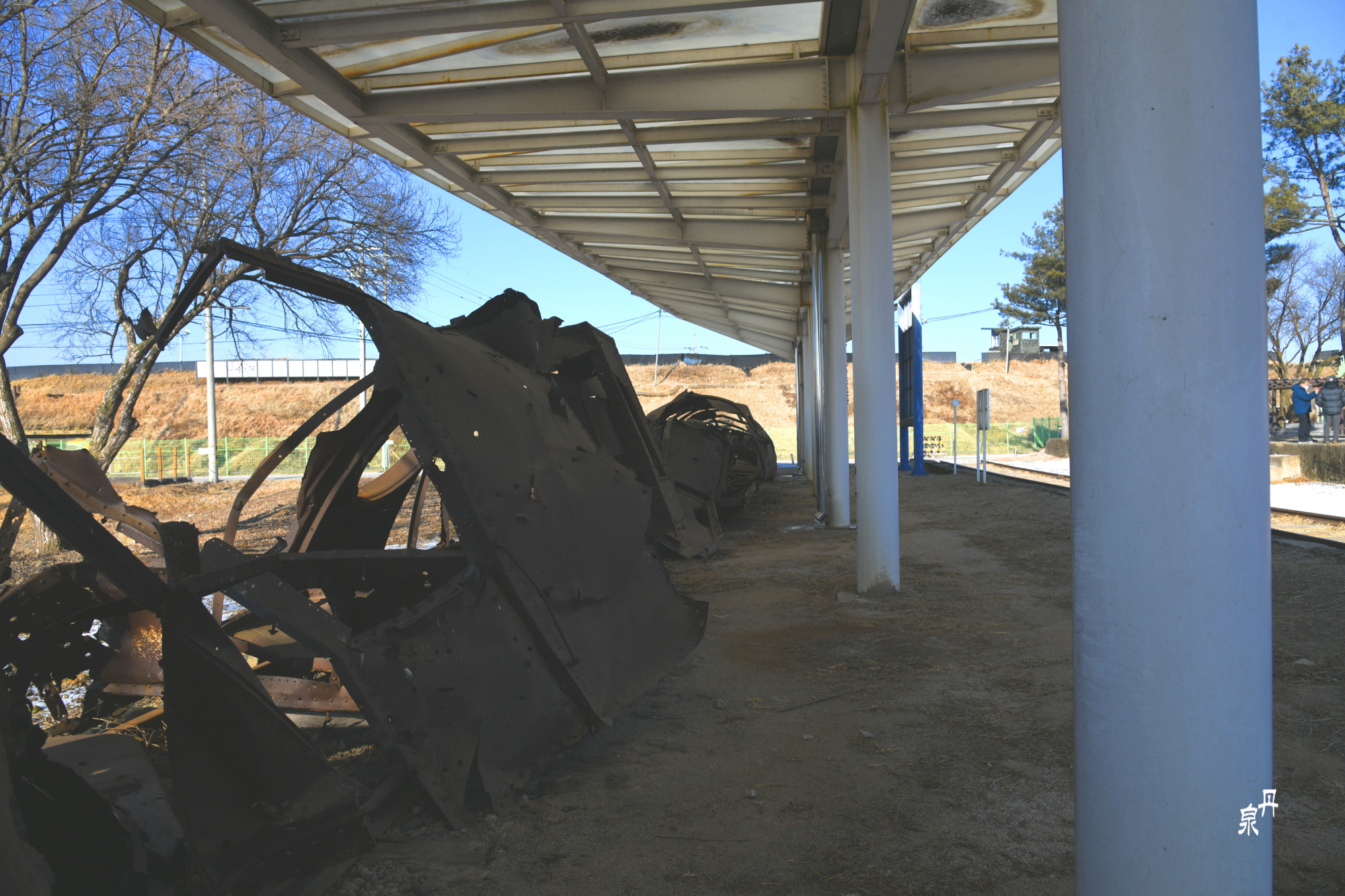 역내의 부서진 기차가 있는데 북한군이 철수하면서 기관차만 가지고 가서 객차만 남아있다