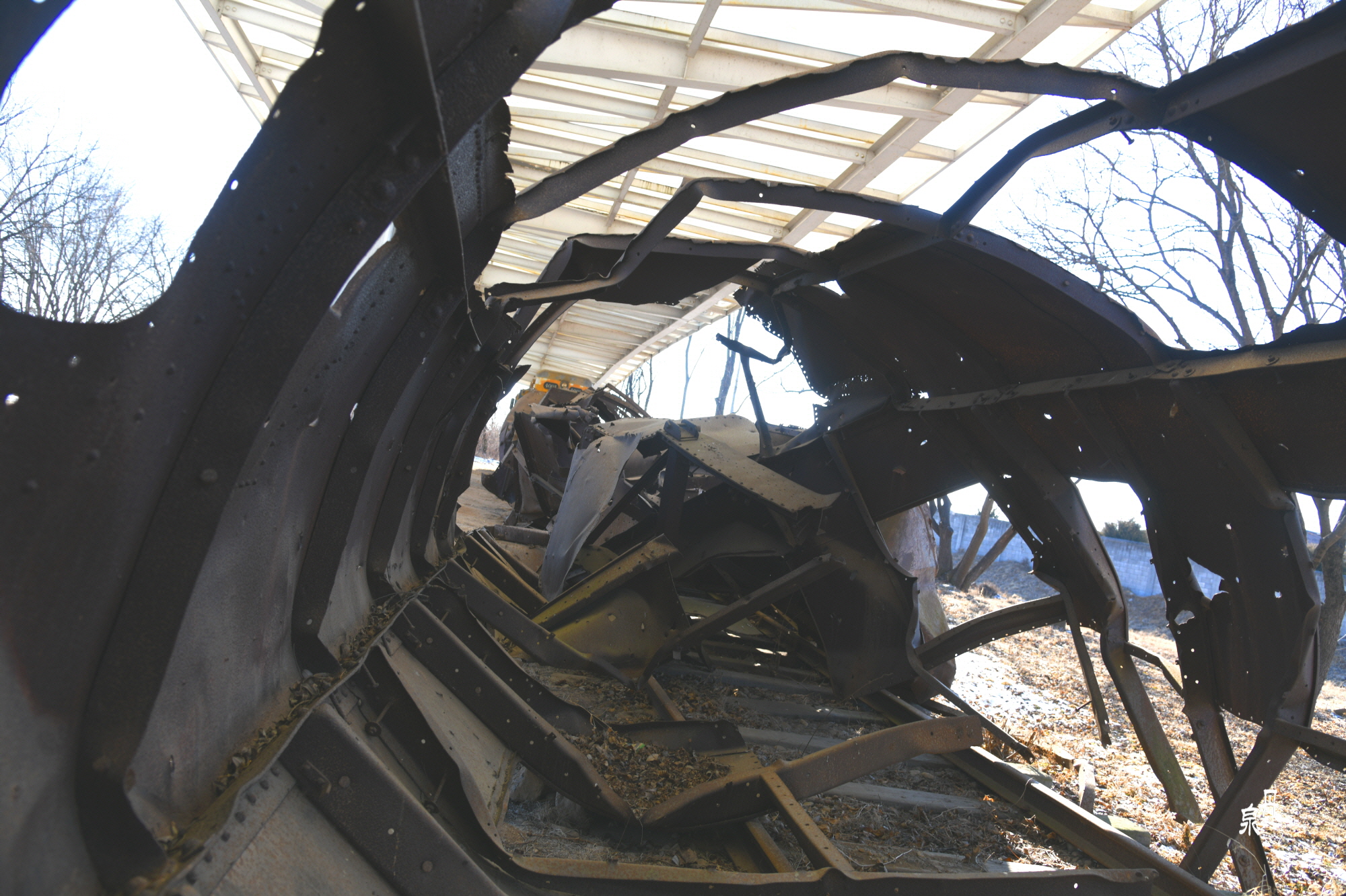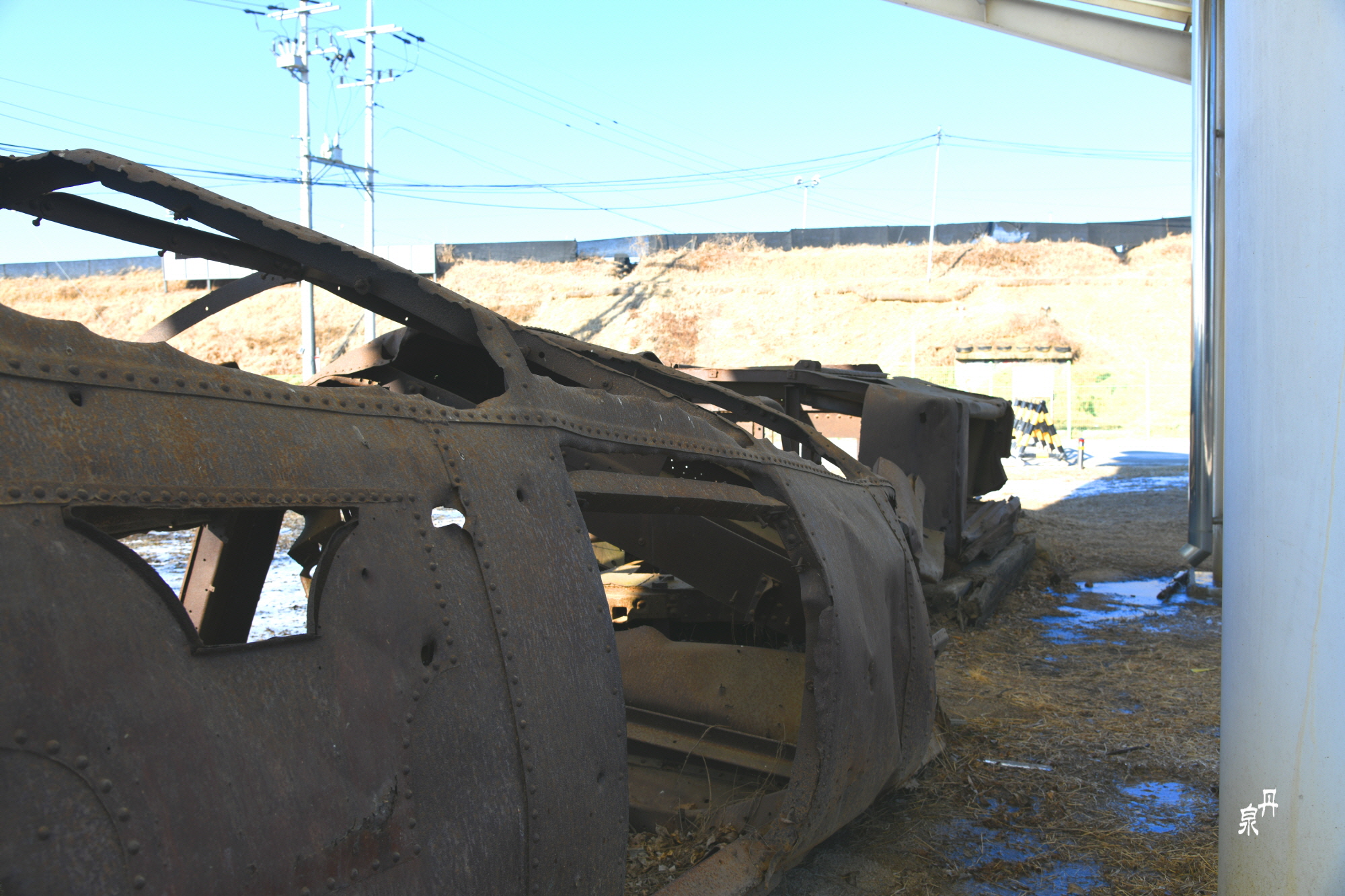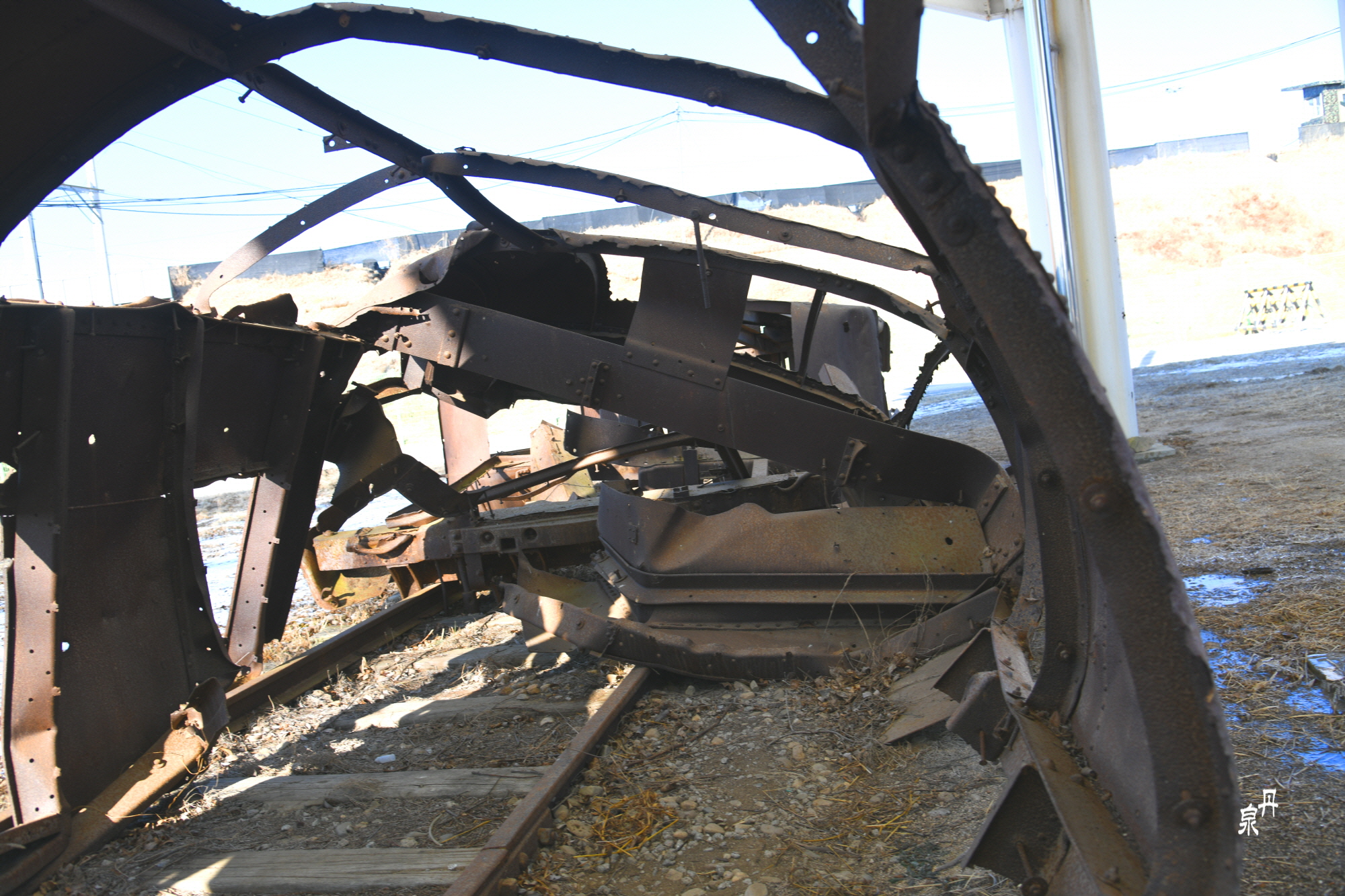 역내의 부서진 기차가 있는데 북한군이 철수하면서 기관차만 가지고 가서 객차만 남아있다