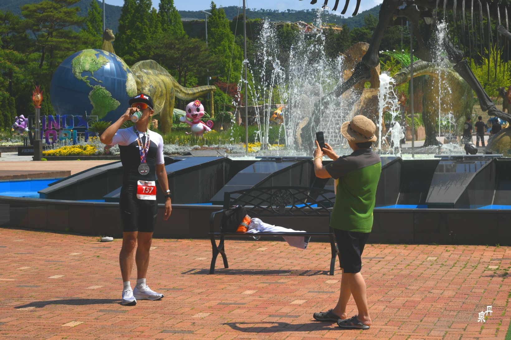 철인경기중 제일 힘들고 기권자가 많이 나오는 마라톤 157번은 카메라만 보면 여유를 부린다