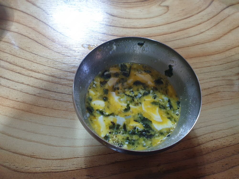 벽에 써있는 설명대로 국 국물 몇 스푼을 넣고 잘 으깨고 져어서 먹으니 아침에 좋다
