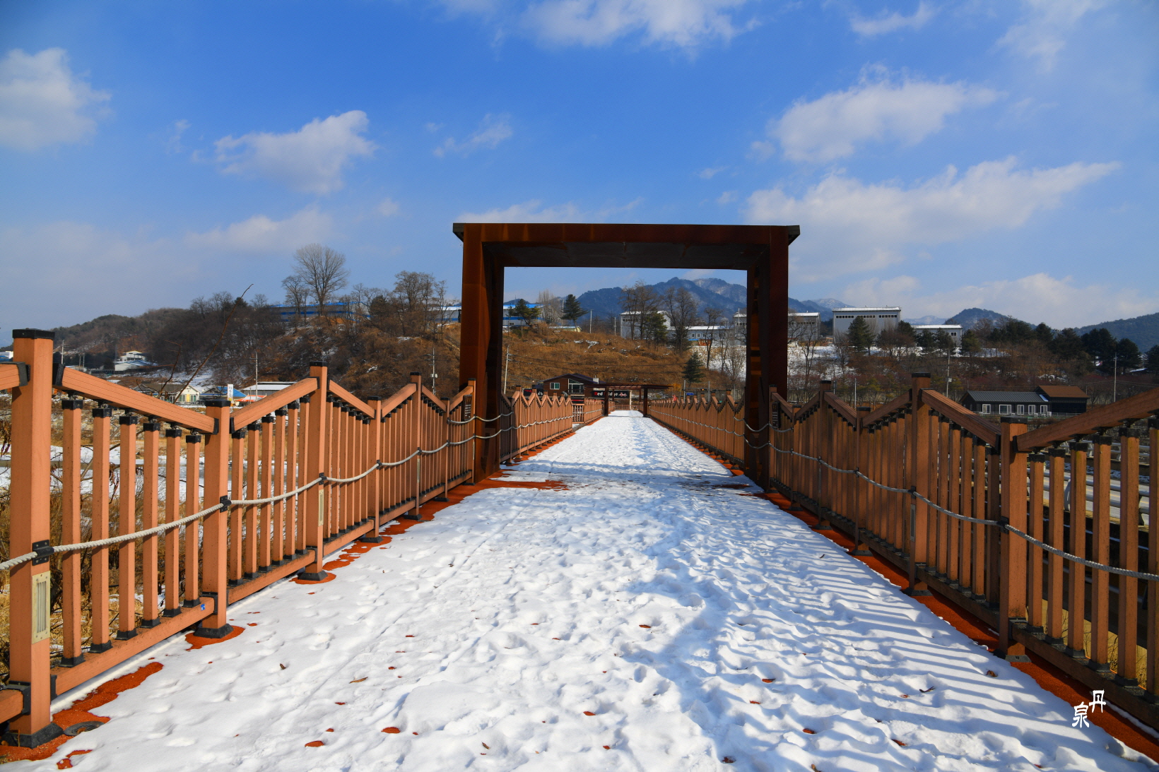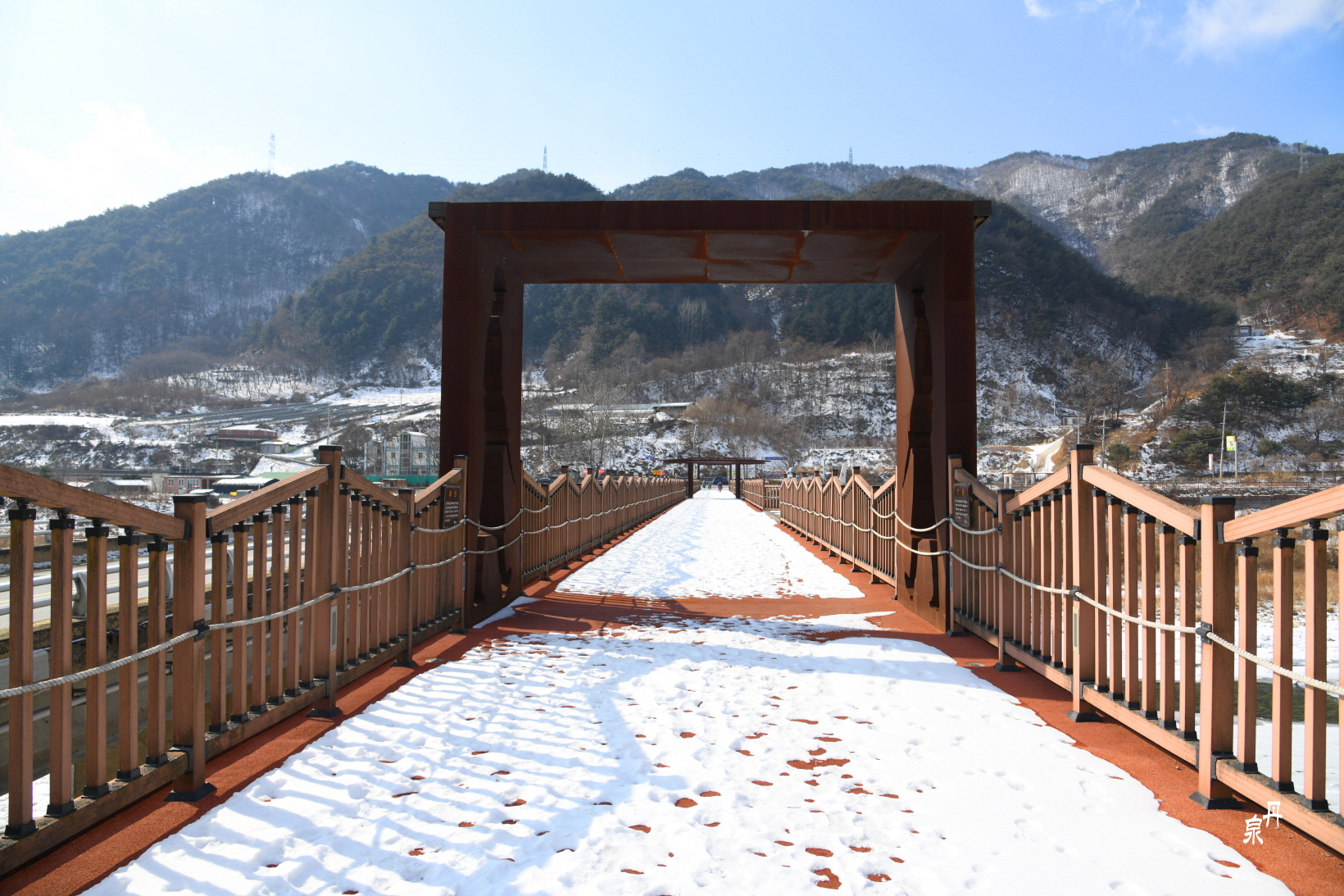 유언을 전 해 들은 부인이 1957년 12월 길이 150m 폭 3.6m의 목재난간 다리를 설치하였다.