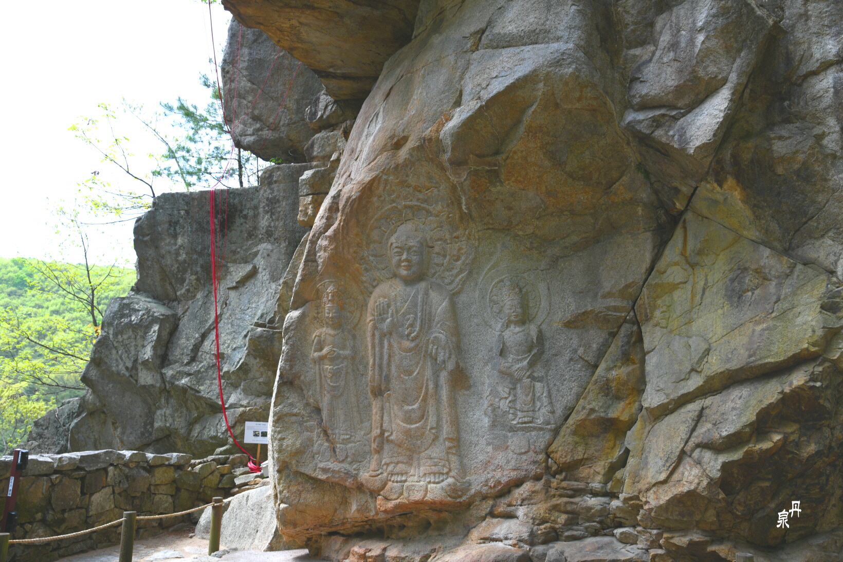 바위 위에 붉은 선이 보이는데 암석이 벌어지는 것을 체크하고자 설치한 감지기용 전선이다