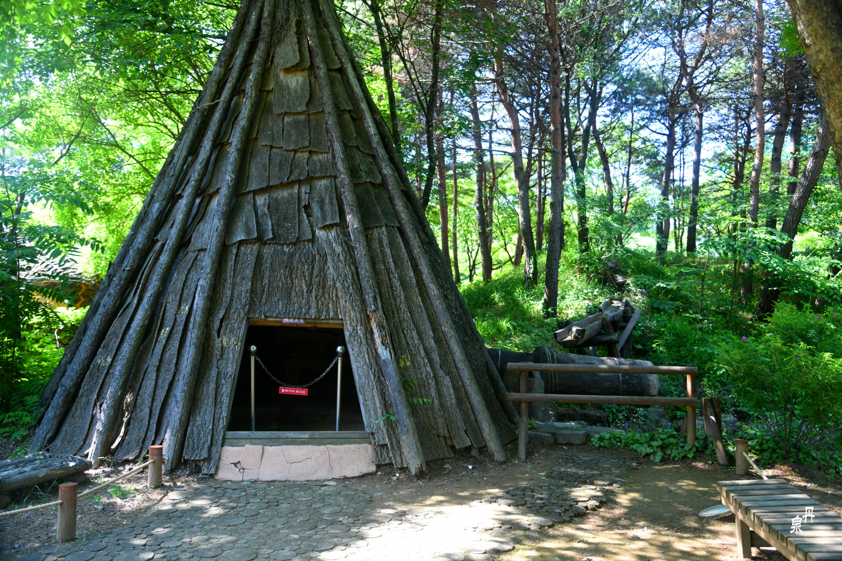 귀틀집, 껍질을 벗긴 통나무를 우물정(井) 자로 쌓아 올려 벽체를 만들고 틈새는 진흙으로 메워 지은집으로