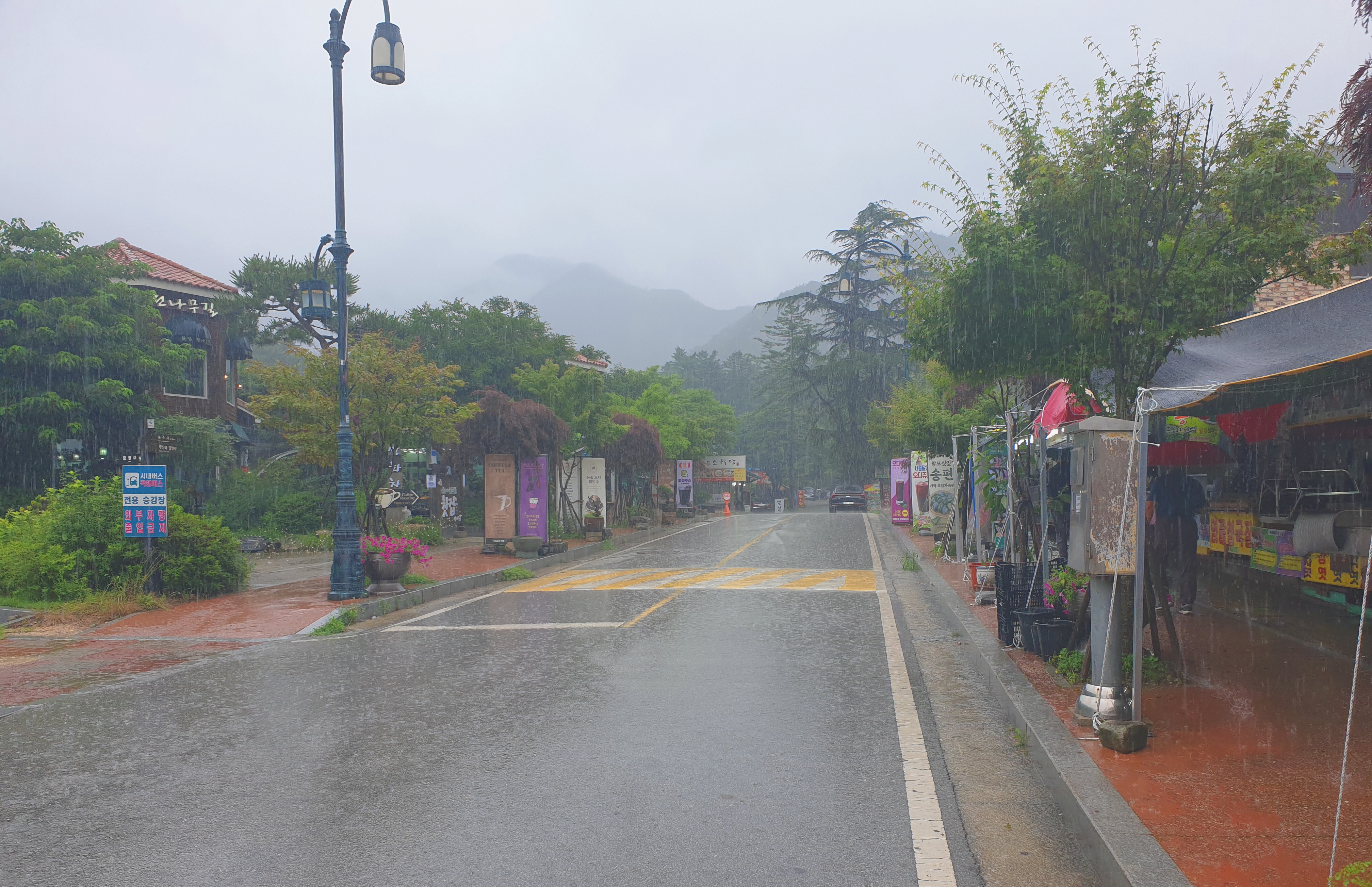 폭우 속 고속도로를 뚫고 내소사 입구에 도착해도 비는 그칠 줄 모르고 계속 퍼붓는다 방문객이 없다