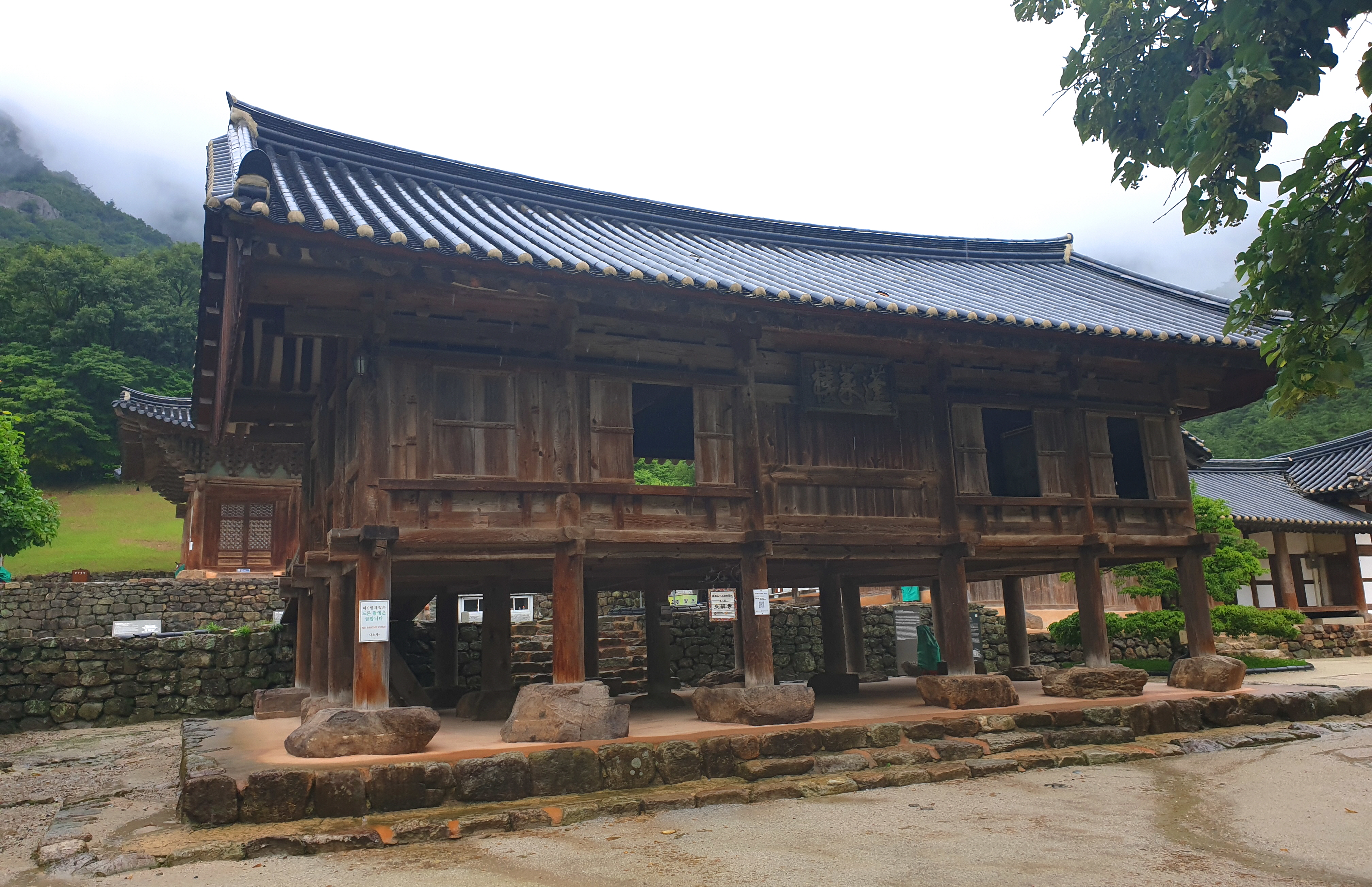 단청을 하지 않은 조선 중기의 보물 제291호 대웅보전이 빗속을 걸어오느라 수고했어하고 반겨준다