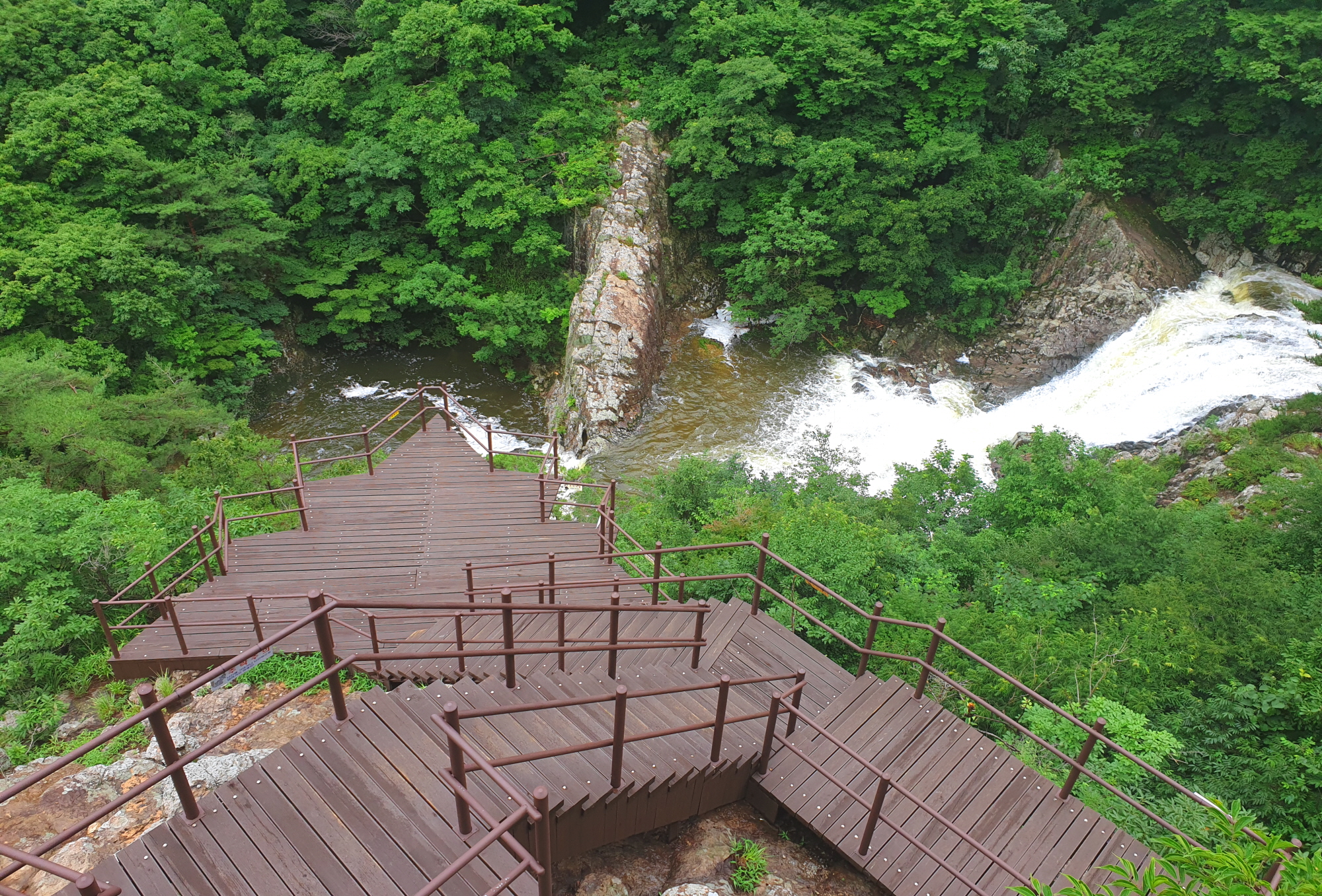 전망대 아래로 물이 무섭게 흐른다 폭포 아래에는 분옥담 선녀탕등이 있으나