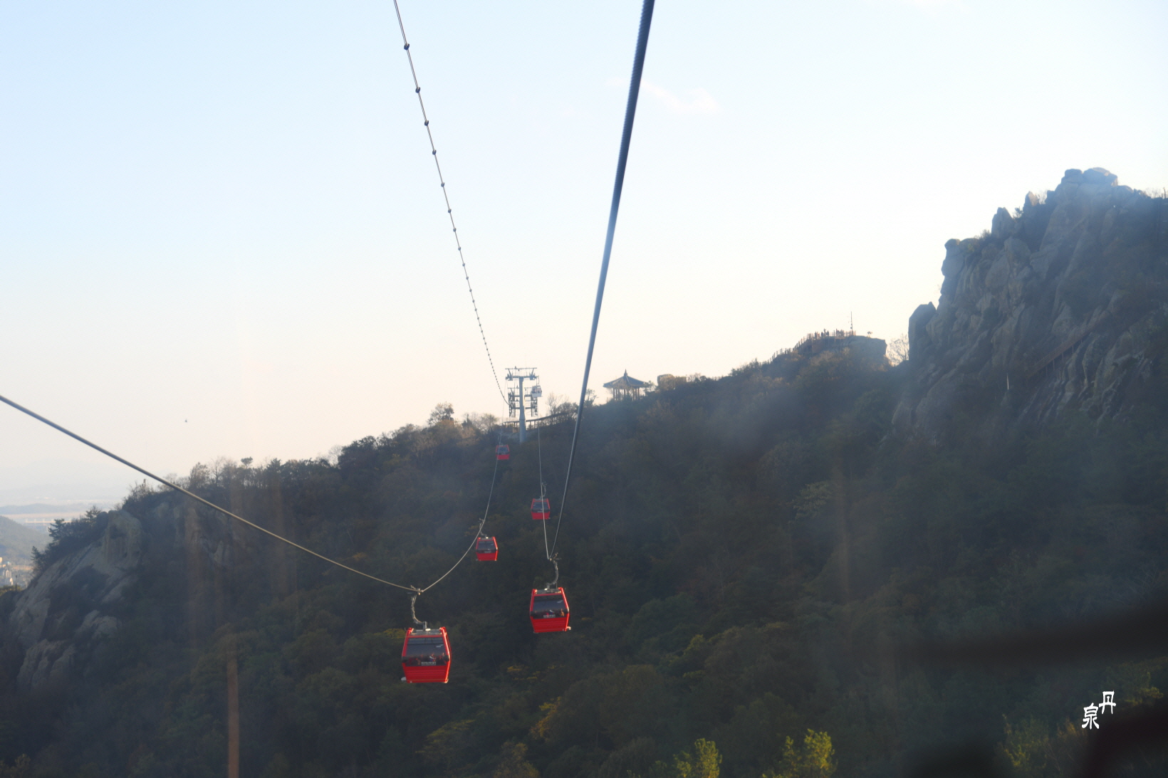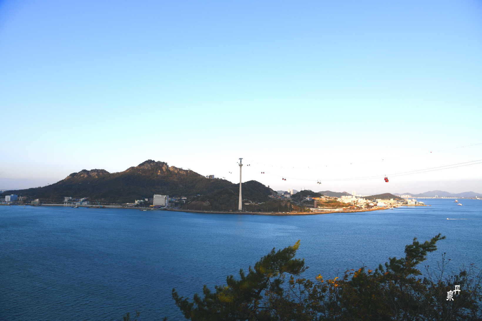 산 위에 바다를 건너는 케이블카 지주가 서있다